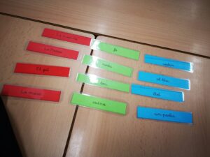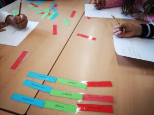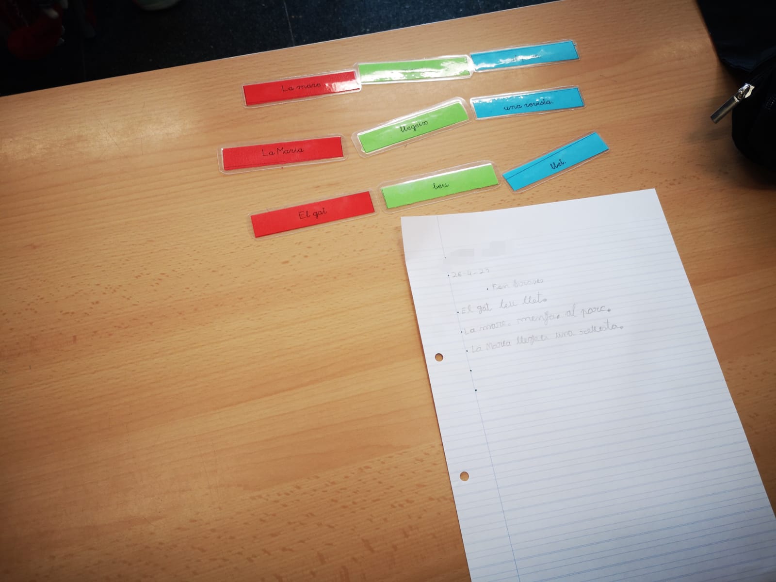 Els nens i les nenes de primer estem treballant les frases. Per aquest motiu, en algunes sessions de llengua catalana aprofitem per a confegir oracions en petits grups. Entre tots els membres del grup formem una frase i la llegim per veure si té sentit i, quan estem d’acord, l’escrivim en un full de pauta. Ens estan sortint moltes i ben diferents!