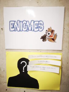 A l’aula de primer tenim el racó dels enigmes. En aquest racó cada setmana es planteja un enigma que els infants han de resoldre. Aprofitant que treballem la descripció de persones, hem començat amb pistes per a descobrir un personatge misteriós. Cada dia es llegeix una de nova i les enganxem al racó perquè estiguin al seu accés per consultar-les quan vulguin. Quan els nens i nenes ja saben de quin personatge es tracta han d’escriure el seu nom en un full, així treballem l’escriptura, i després el guarden en una caixa. En llegir totes les pistes, obrim la caixa i posem en comú les respostes.