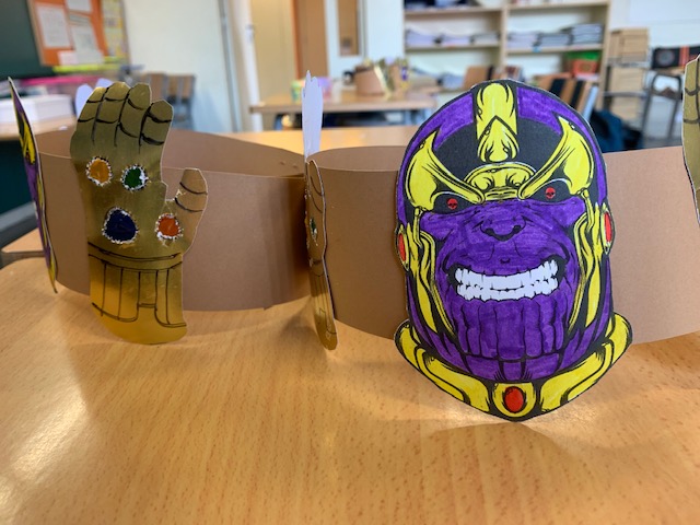 Aquest any el carnestoltes l’hem ambientat de superherois/heroïnes i Villans, 2nA hem escollit el Spiderman i 2nB Thanos. Per representar-nos vam elaborar un complement, que podeu veure a les fotografies i ens el vam posar ahir per rebre el carnestoltes.