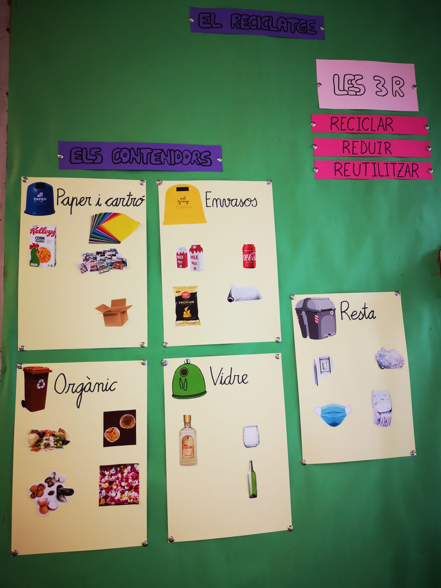 Els nens i nenes de segon hem iniciat el projecte del reciclatge. Primerament, hem treballat quines són les 3R: reutilitzar, reduir i reciclar. Després, hem repassat els contenidors i les deixalles que s’han de llençar en cada un d’ells.