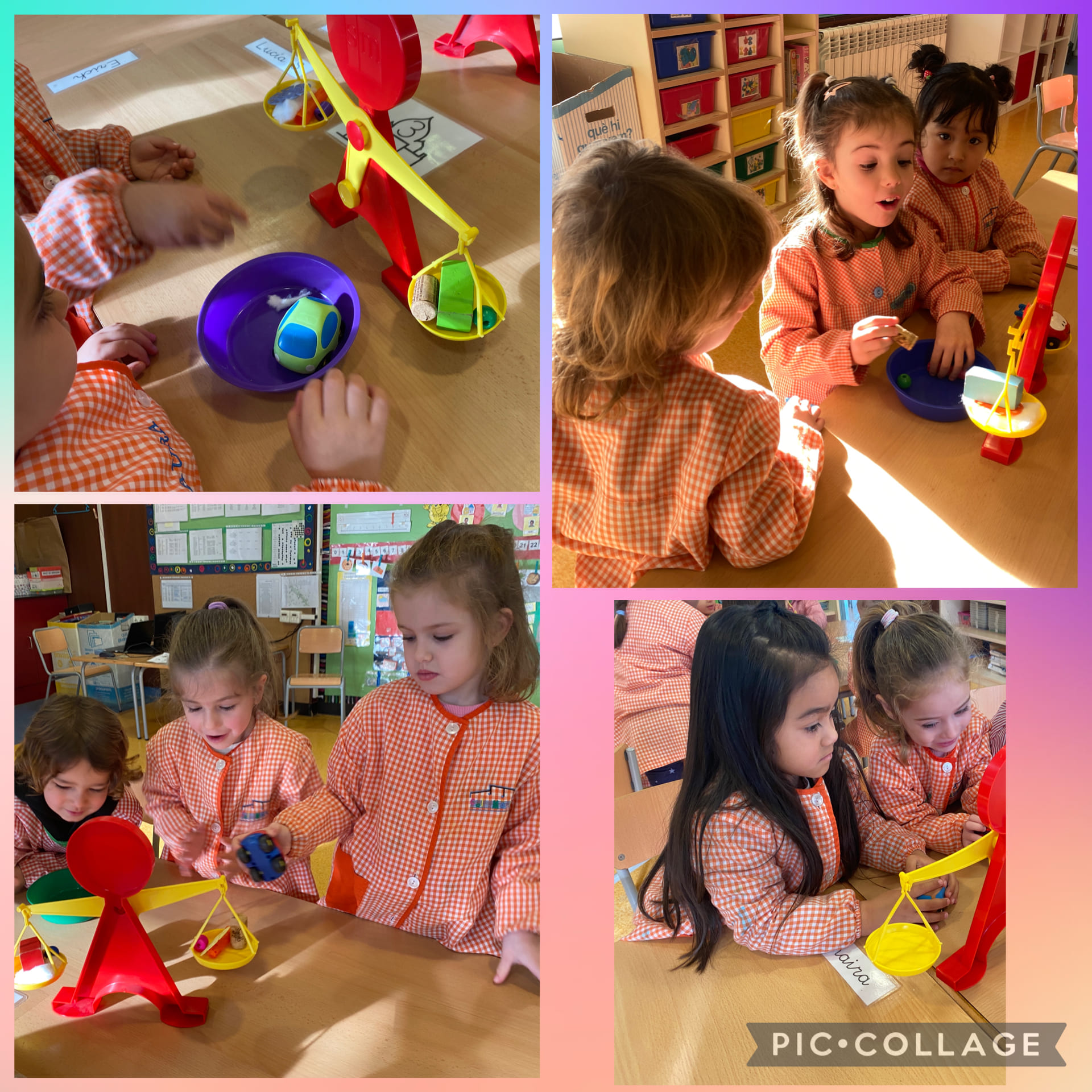 Els nens i nenes d’I4 hem experimentat amb el pes en petit grup, comparant diferents objectes que podem trobar a l’aula, i fent hipòtesis sobre quin o quins podrien pesar més, igual o menys, i si la mida de cada objecte era un aspecte rellevant o no. Una activitat manipulativa i vivencial que hem gaudit molt i que ens ha fet pensar i reflexionar.