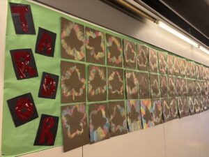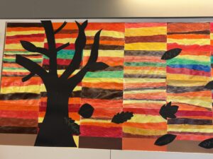 Les tres classes de la primera planta vam gaudir molt decorant el nostre passadís. Entre tots i totes i amb l’ajuda d’algunes mares vam fer un gran mural amb els colors de la tardor i vam posar-hi fulles de color negre per fer contrast. També vam fer uns mòbils triant diferents elements de la tardor, com les fulles, les castanyes, els aglans o les botes d’aigua. Uns dies abans vam fer una activitat de plàstica creant fulles tot resseguint el contorn en un full de color marró amb diferents guixos de colors. No hi ha cap fulla igual!
