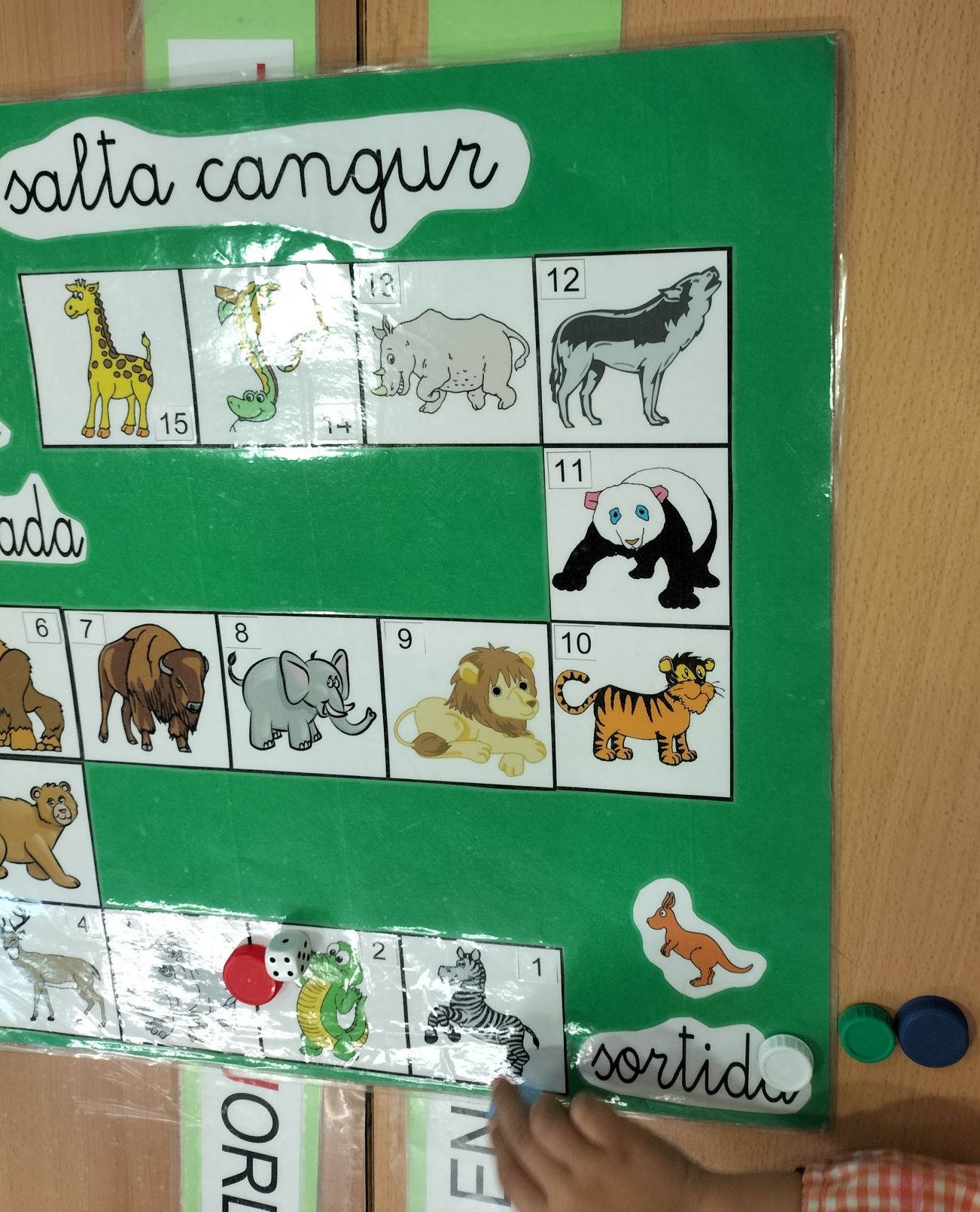 En el joc de Salta cangur es presenta el taulell i es miren els animals que apareixen. Llavors cada infant té una fitxa que col·loca a la sortida i ha d’anar tirant el dau fins a l’arribada.