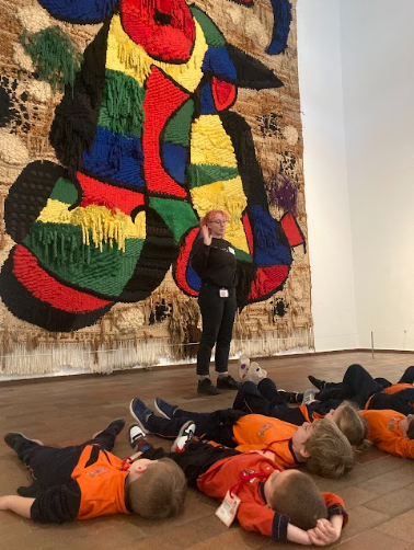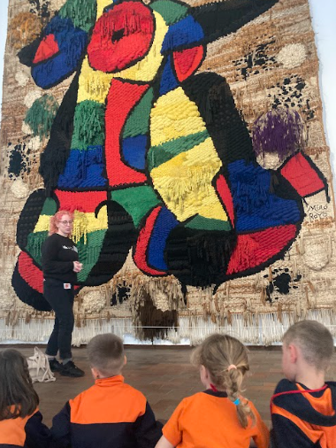Aquest tapís és tan gran que el vàrem observar des del terra. L’educadora ens va explicar que el van teixir entre 12 persones! Vam poder compartir què hi veia cadascú.