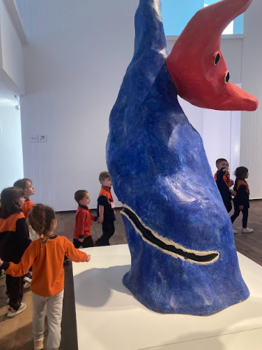 Aquesta escultura és molt gran! Vam aprendre que Miró pintava el sol de color vermell i la lluna de color blau, però en aquesta ocasió va intercanviar els colors, doncs la lluna i el sol es fan una abraçada.