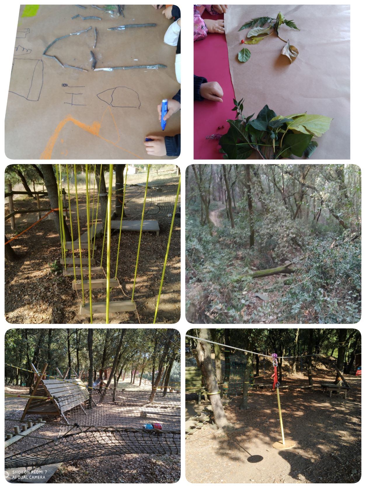 El dia de l’excursió al Castell de Can Fluvià, vam fer un passeig pel bosc i vam trobar molts elements de la tardor que anavem recollint pel camí. Després, vam fer un mural amb tot allò que vam trobar. A més, vam fer un minicircuit d’aventura i ens vam atrevir a fer-ho tot. Ens va encantar.