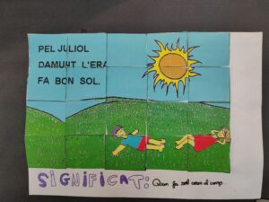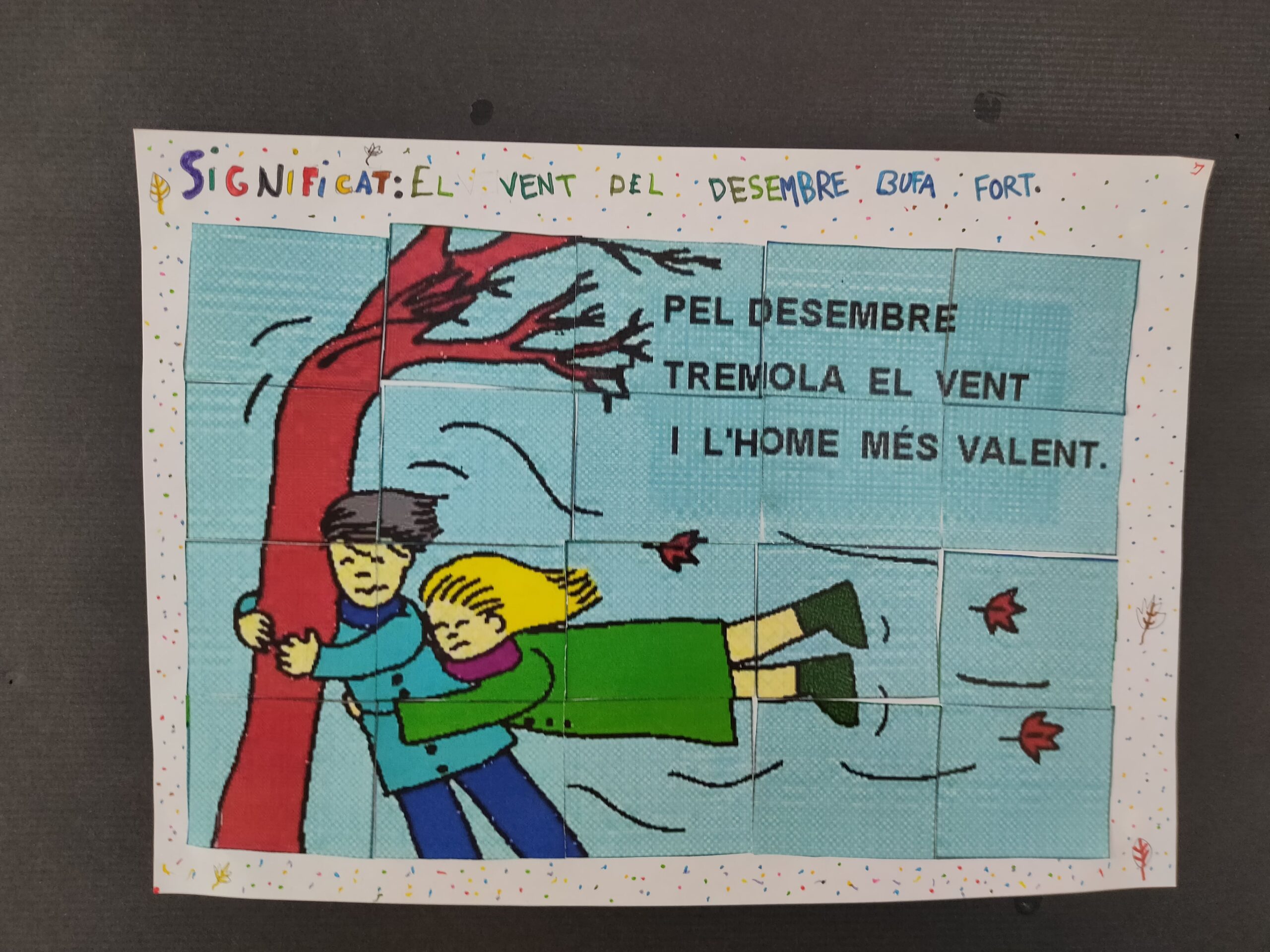 Des de l’àrea de català, l’alumnat de 3r ha treballat les dites dels mesos de l’any. Així s’han endinsat en el llenguatge popular i han conegut que les dites són oracions que rimen i tenen un significat. Per treballar les dites han construït diferents trencaclosques per tal d’esbrinar l’oració i el dibuix que l’acompanya.