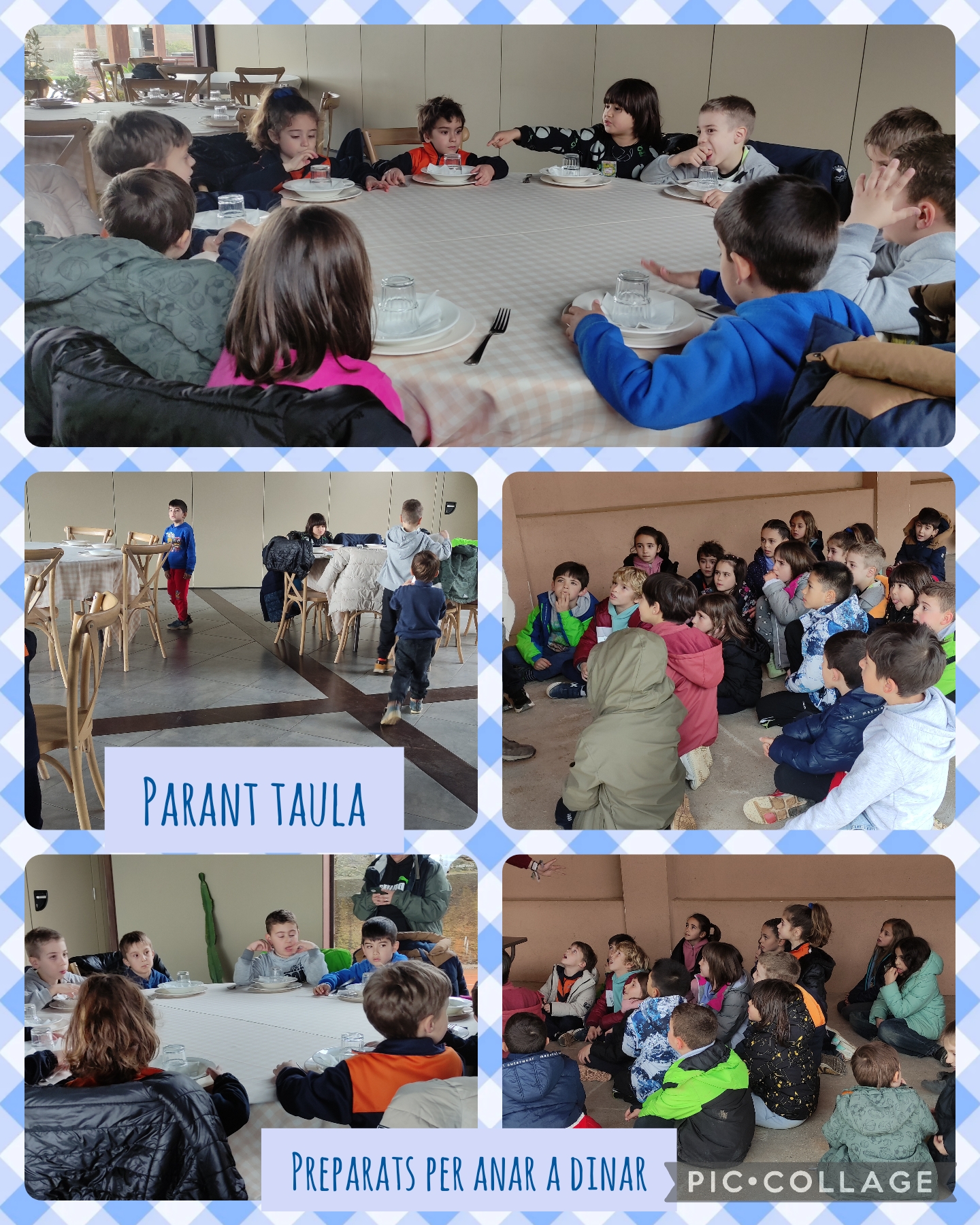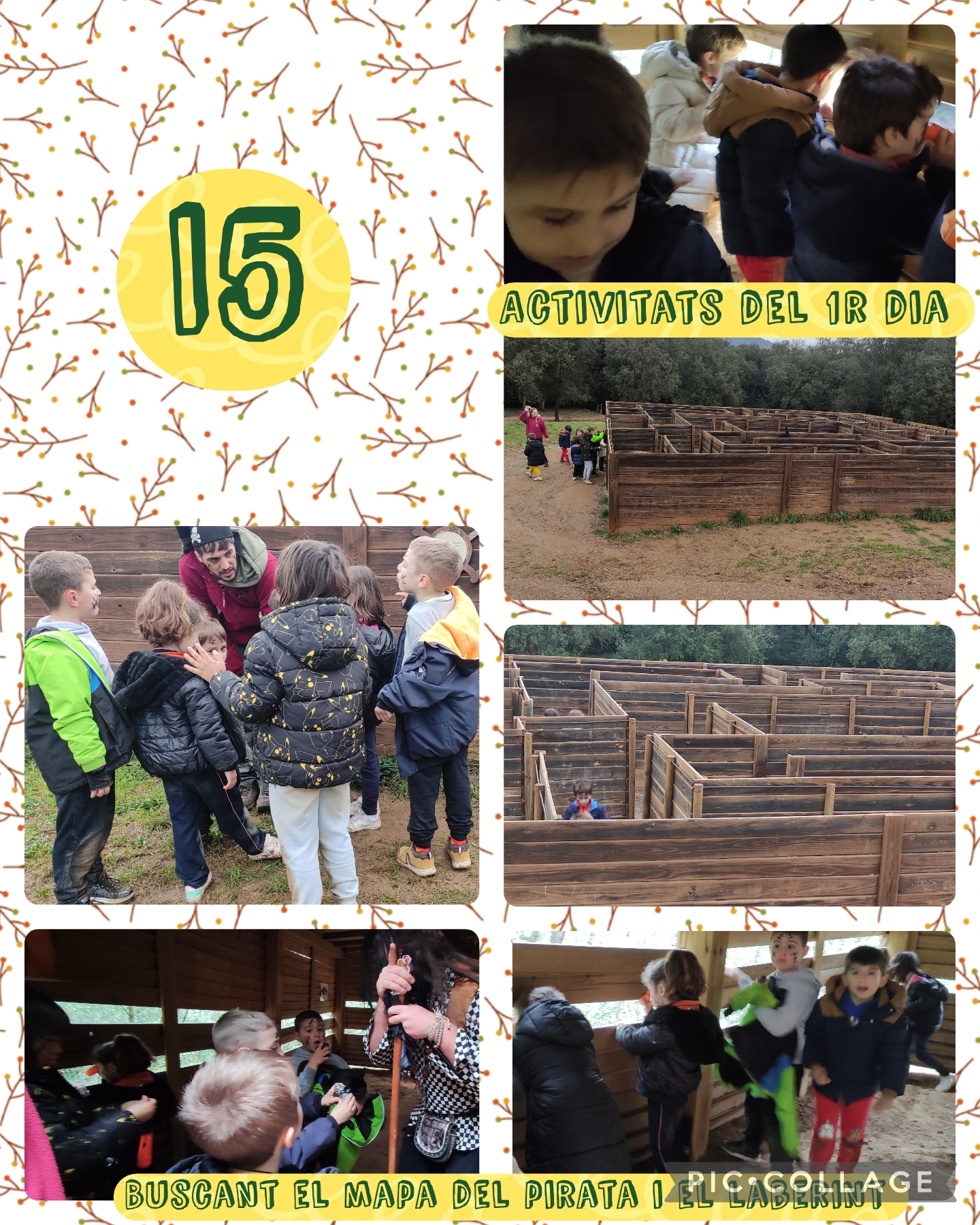 Alguns nens i nenes la classe dels porquets ja estem de colònies. Avui hem preparat els llits, ens ha vingut a veure el pirata Malapata, hem fet un joc de pistes per trobar els trossos del mapa del tresor, ens ha tocat parar taula i hem tingut una estoneta de joc lliure abans de sopar.