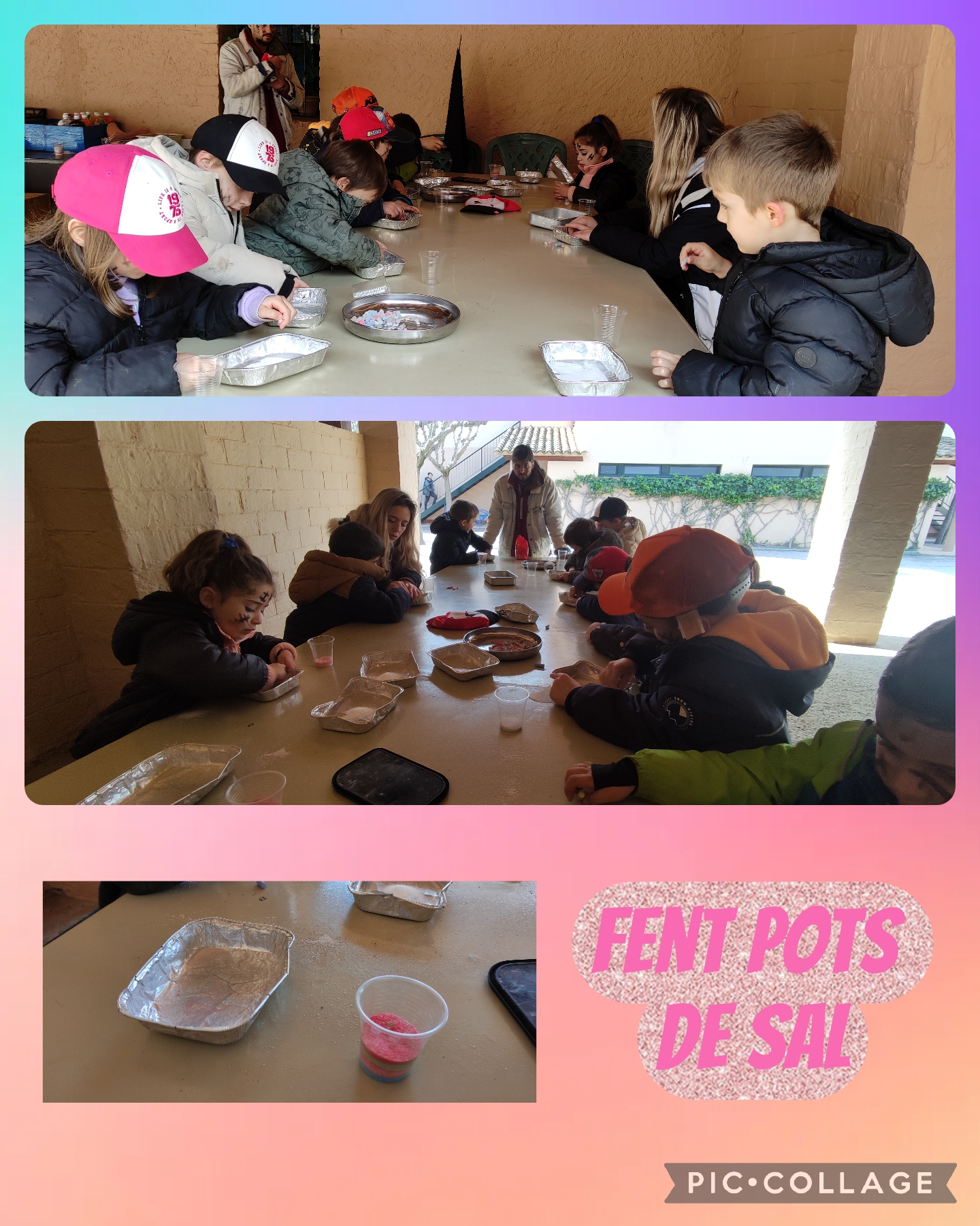 A la tarda, vam fer pots de sal. Hem pintat sal amb guixos de colors i les hem posat a un pot. Ens ha quedat molt xules.