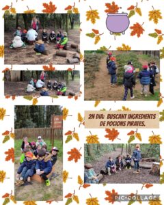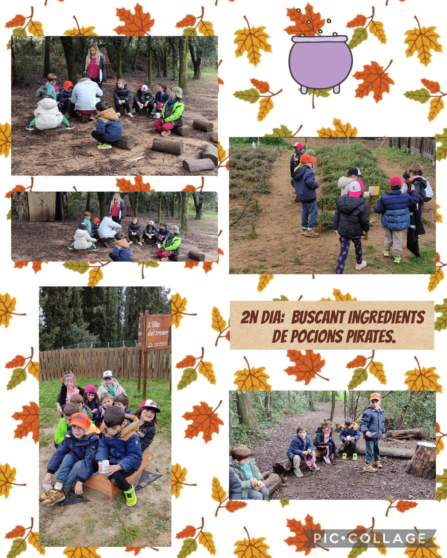 Al segon dia de colònies vam estar buscant els trossos de mapa del tresor que ens faltava, vam buscar els ingredients per fer unes pocions pirates per curar el mal de queixal i les diarrees del pirata Malapata. Hem anat a l’hort de les herbes a buscar romaní, hem trobat pèl d’animal, a la farmacia pirata hem trobat aigua vermella i caca de mosca i amb tot això hem fet una poció.