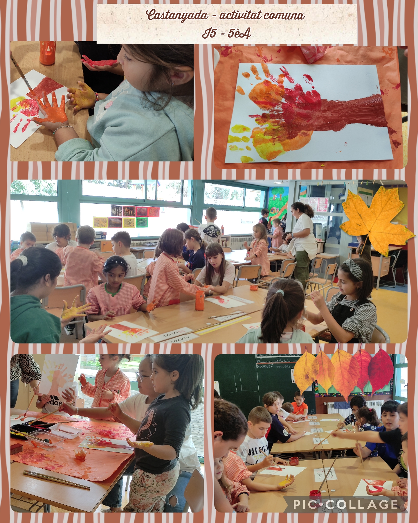 L’altra ha estat la trobada amb els nens i nenes de 5èA, que seran els nostres padrins lectors, ens havíem preparat un arbre estampant les nostres mans amb pintura i els colors de la tardor. Ha quedat xulíssim i ens hem divertit molt compartint aquesta estona.