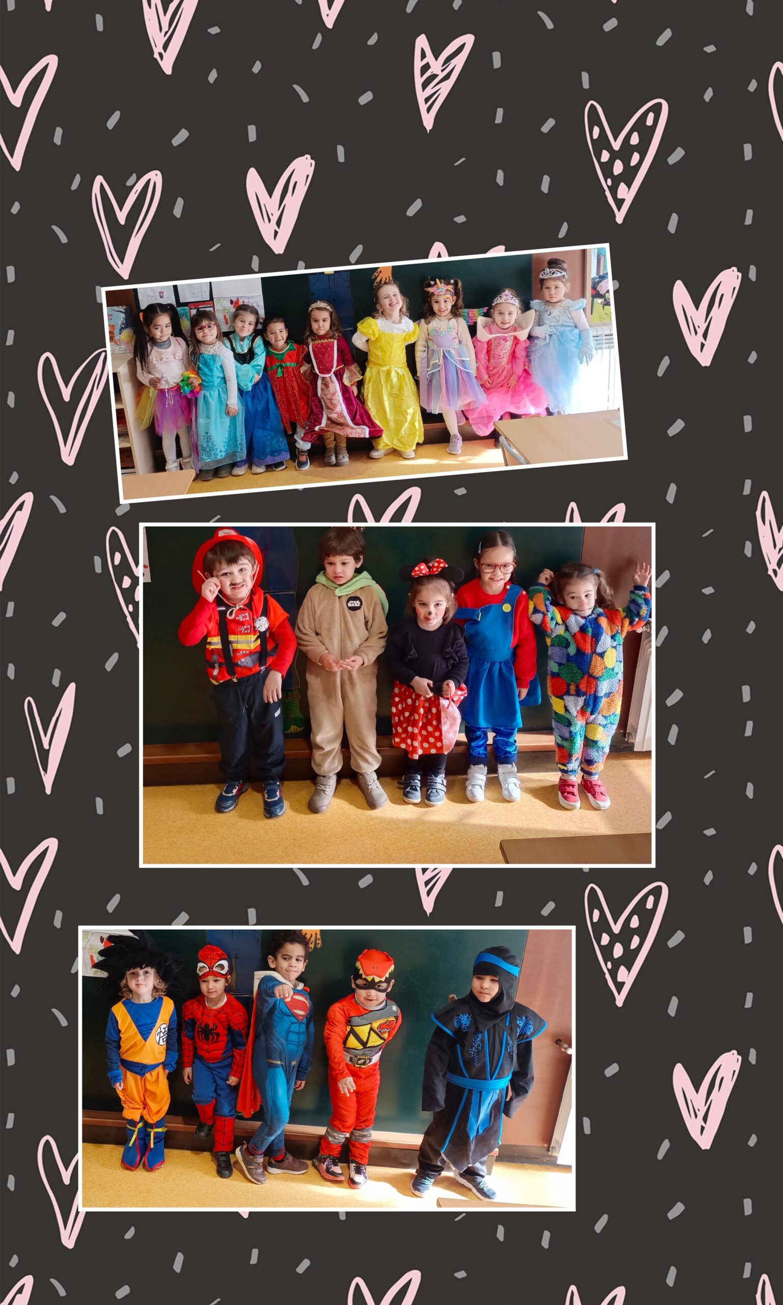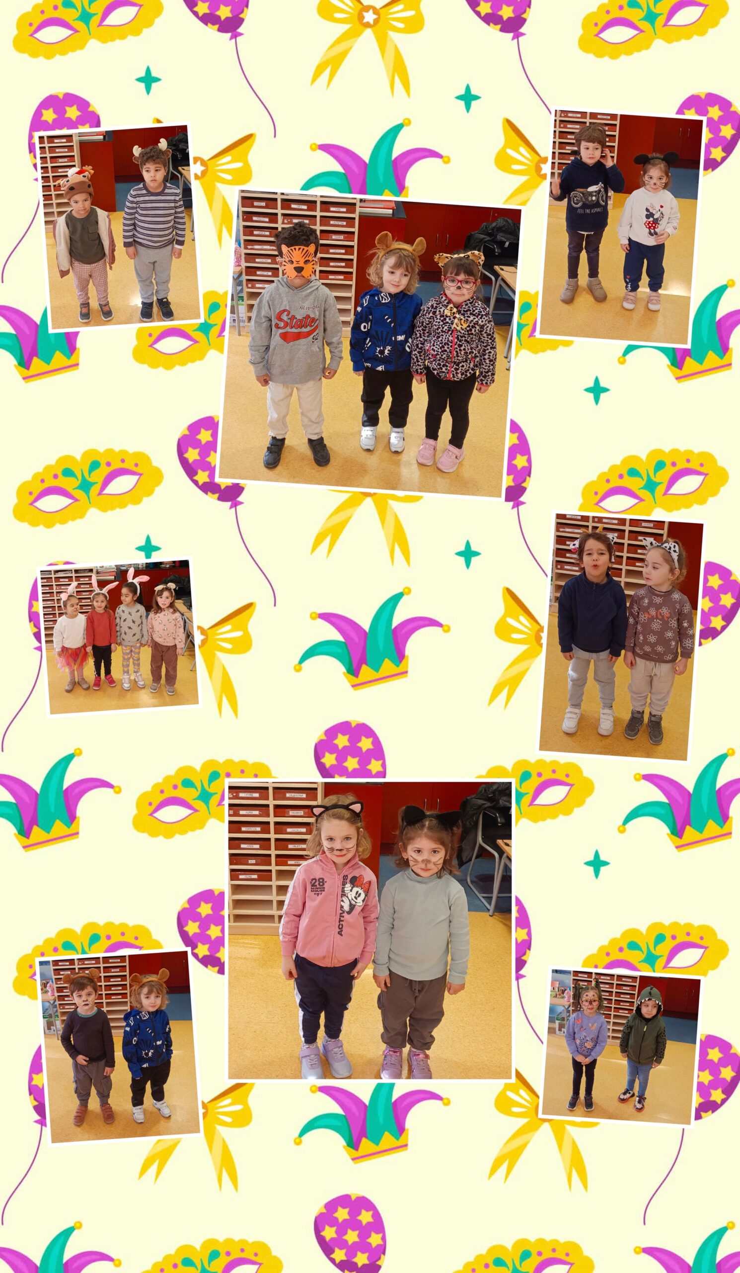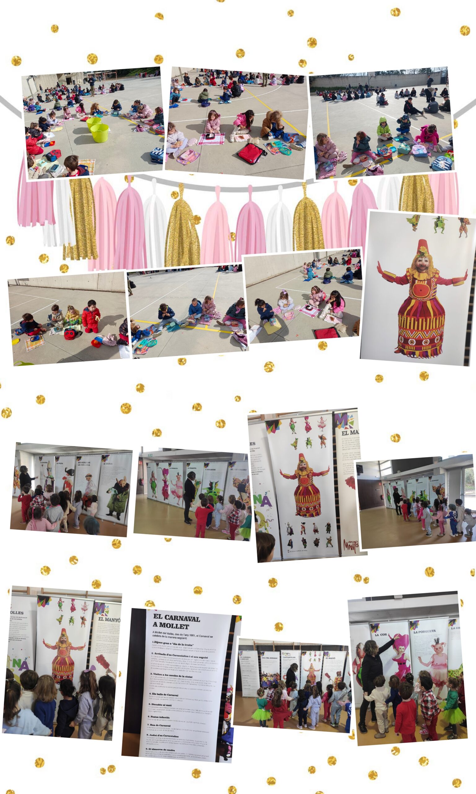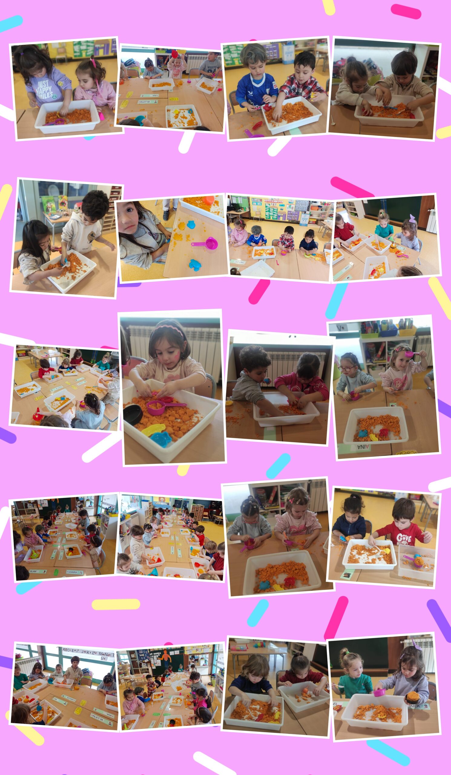 Aquí teniu la setmana del carnaval on cada dia anàvem d’una consigna diferent, i el divendres a la rua tots disfressats, amb una disfressa ben maca. Va ser una setmana boja, però ens ho vam passar molt bé. També vam aprofitar aquella setmana per experimentar amb sorra cinètica de color taronja.