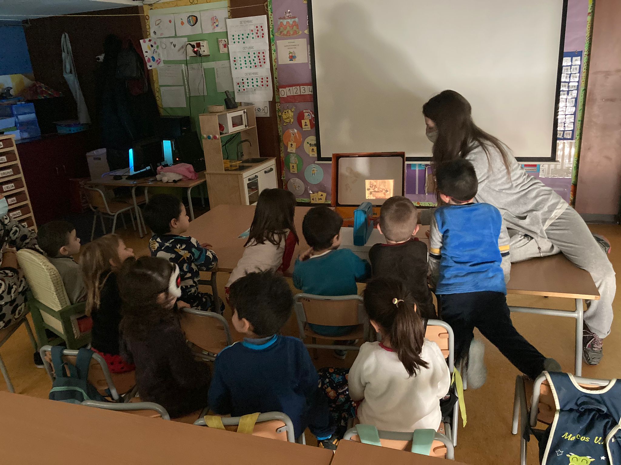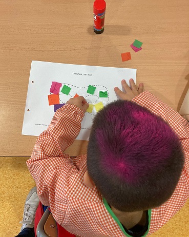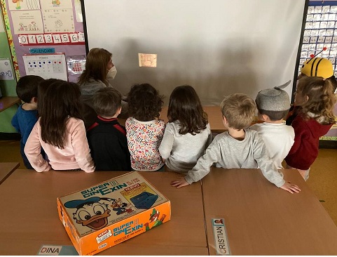 Els nens de P3 hem celebrat el nostre primer Carnaval a l’escola. Hem viscut una setmana molt divertida, realitzant activitats relacionades amb el món del cinema i d’aquesta festa tan engrescadora. Hem tingut la visita del Rei Carnestoltes de manera virtual i cada dia hem seguit les seves consignes fins al divendres que ens vam posar la nostra disfressa. També hem fet un dia de cinema, amb crispetes! Hem vist les pel·lícules Trolls i Spirit per inspirar-nos en una manualitat que vam elaborar. Hem visualitzat pel·lícules antigues, en blanc i negre i mudes, així com els primers dibuixos del Mickey Mouse i hem contrastat amb els actuals. També hem tingut la sort de poder gaudir i manipular una joguina de reproduir pel·lícules (Cinexin). Una altra activitat que ens ha agradat molt ha sigut les ombres xineses, on hem experimentat amb l’ombra i la llum, fent projeccions amb el nostre cos, amb siluetes, amb titelles…