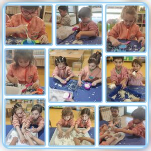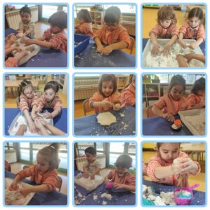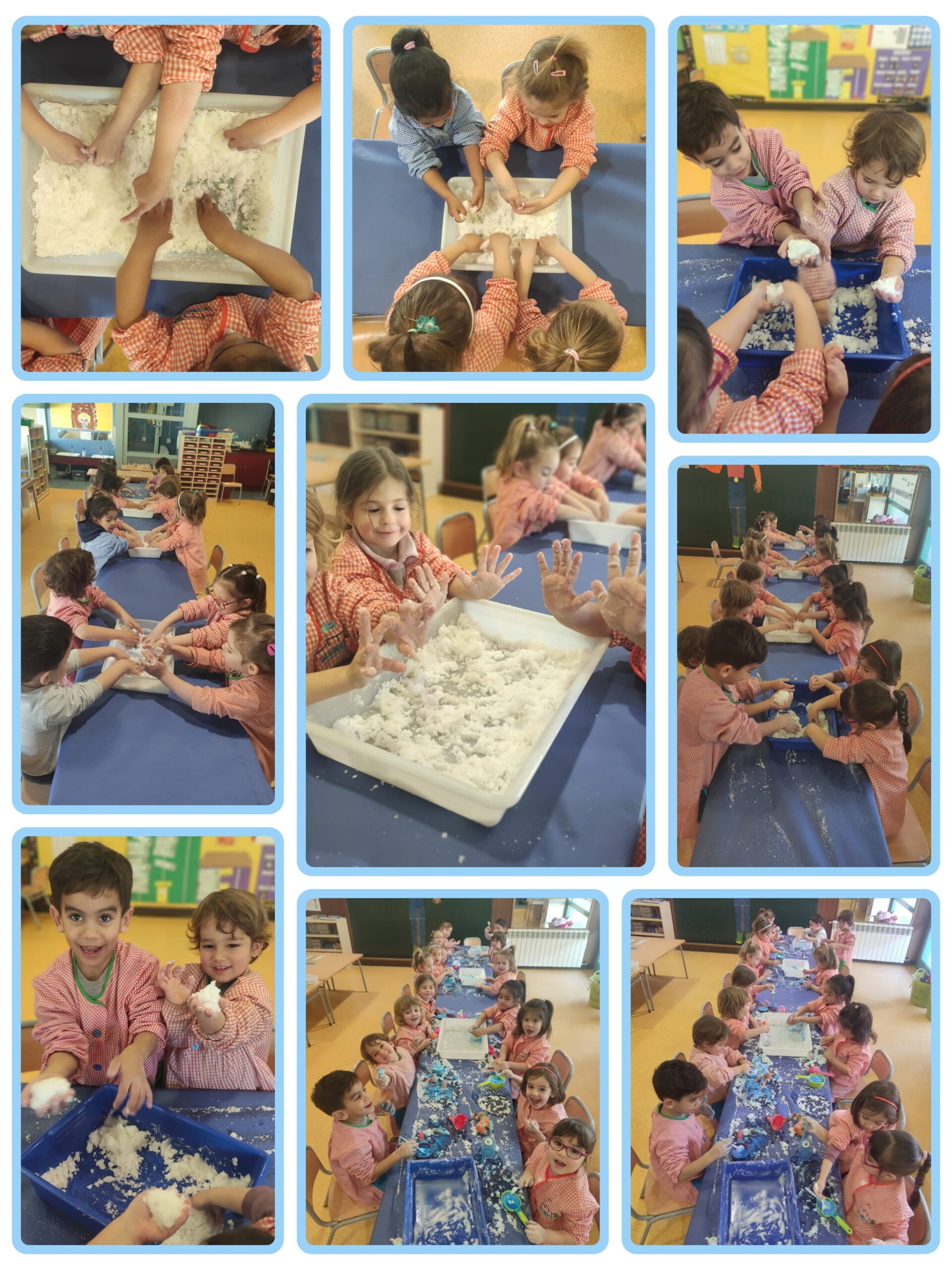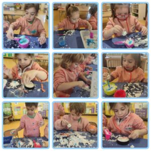 A la classe d’I3 vam explicar el conte del lladre de neu. És un esquirol que descobreix la neu, i quan surt el sol tota la neu s’ha fos. L’esquirol creu que hi ha un lladre de neu que se l’ha endut. Vam aprofitar el conte i a la tarda vam fer neu a l’aula. Vam tocar la neu i vam veure que estava molt freda, vam fer pastissos, transvasaments amb culleres i fins i tot la vam pintar de blau amb comptagotes i pintura blava aigualida. Va ser genial, ens ho vam passar molt bé i fins i tot.