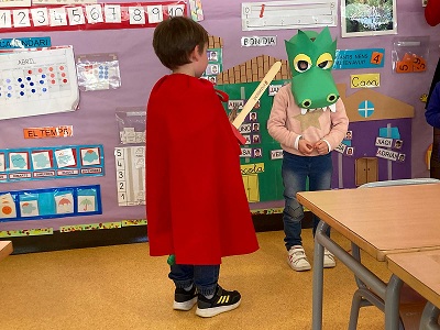 Durant tota la setmana hem fet activitats relacionades amb aquesta festivitat. Primer vam conèixer la Llegenda de Sant Jordi. Vam participar a un concurs de dibuix i de punt de llibre per als Jocs Florals, vam poder veure com els nens de P-5 cantaven i representaven cançons d’aquesta festa i també vam gaudir de la representació de la llegenda per part de les mestres i desprès vam jugar a que els propis infants fessin els personatges. A música hem cantat cançons de Sant Jordi i hem elaborat titelles de pal per poder explicar el conte a casa.