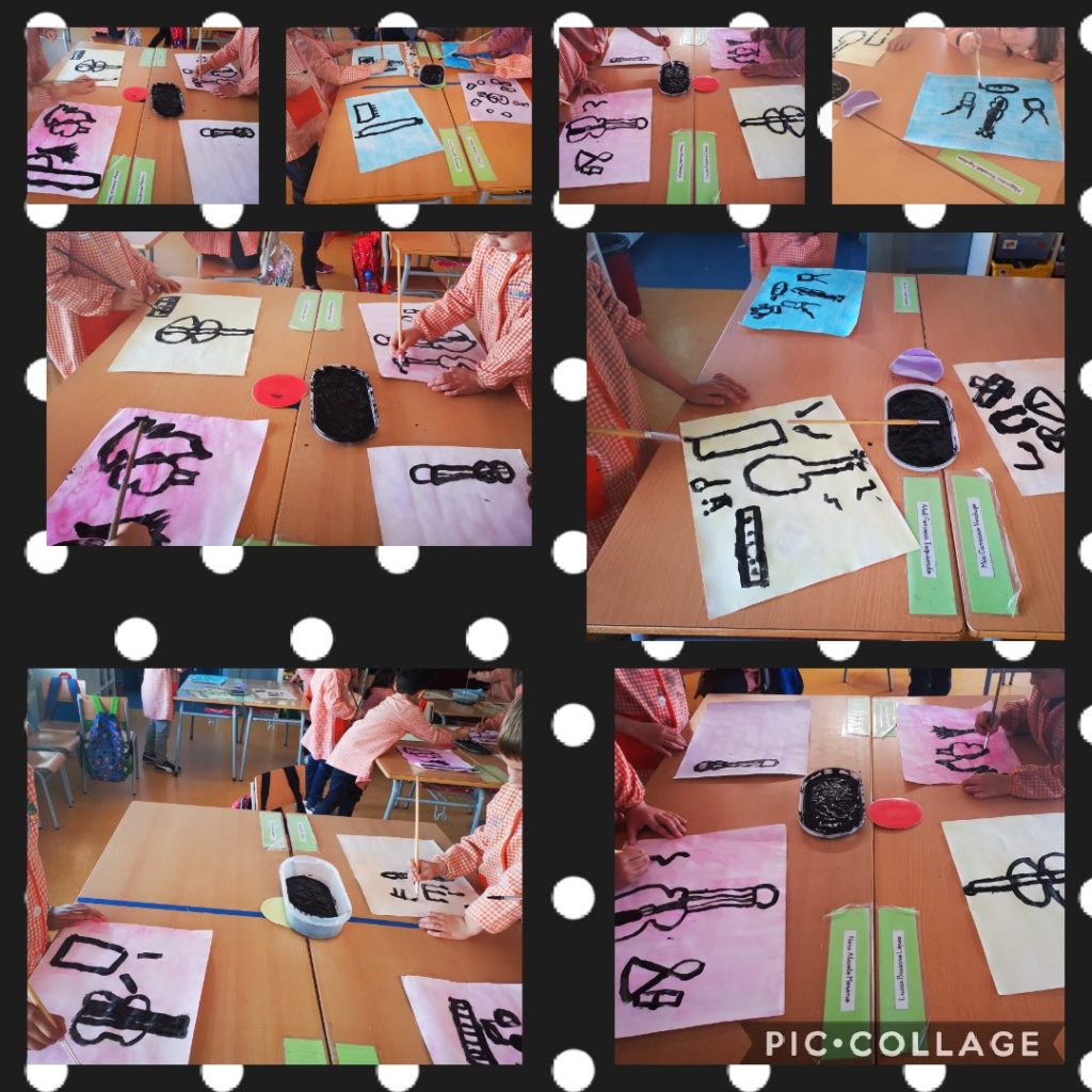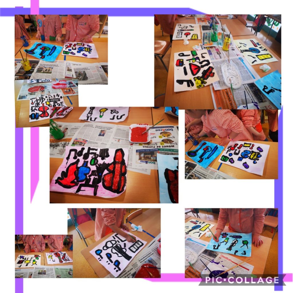A plàstica seguim treballant Kandinsky, aquest cop hem dibuixat diferents instruments amb pintura negra sobre un fons de color. A la setmana següent, han acolorit els instruments amb  pintura de diferents colors.