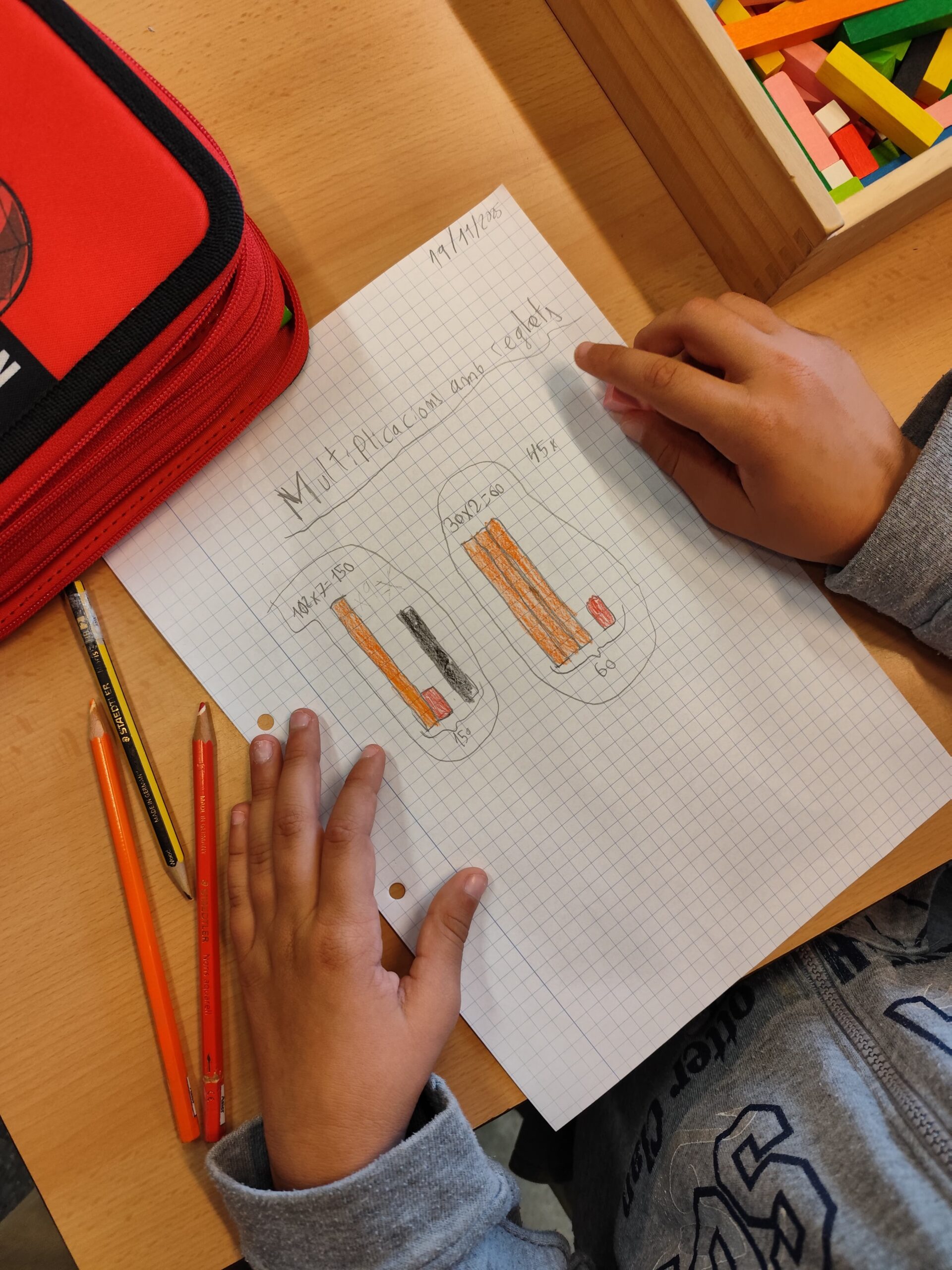 A quart hem estat practicant les multiplicacions amb reglets. Cada nen i nena ha pogut resoldre les multiplicacions de la manera més pràctica i entenedora per a ell o ella. Treballar amb material manipulatiu els permet comprendre millor el raonament de les operacions matemàtiques, més enllà de la memorització de les taules de multiplicar.