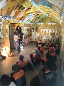 Després de l’excavació, vam visitar una recreació d’una tomba egípcia, on vam poder observar les pintures murals i els jeroglífics que decoraven les cambres funeràries. Aquesta visita ens va ajudar a comprendre millor les creences i rituals dels antics egipcis.