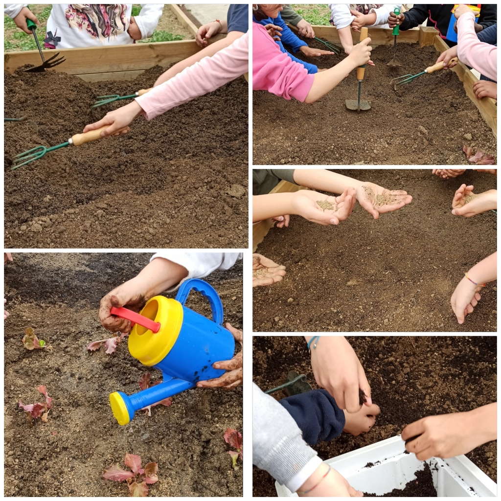 Aquests darrers dies de març hem començat a tenir cura del nostre petit hort. Hem plantat uns enciams fa uns dies i ahir vam sembrar pastanagues. Els enciams han crescut una mica aquesta setmana, sembla ser que la pluja els hi ha anat bé. Les llavors de pastanagues eren super petites, vam remenar la terra per a que s’oxigenés, després les vam llençar per sobre de la terra, les vam tapar amb substrat i les vam regar. Anirem veient com evoluciona cada setmana. Ha estat una experiència diferent i els alumnes han gaudit recordant l’etapa a infantil, ja que l’hort es troba davant d’aquestes aules.