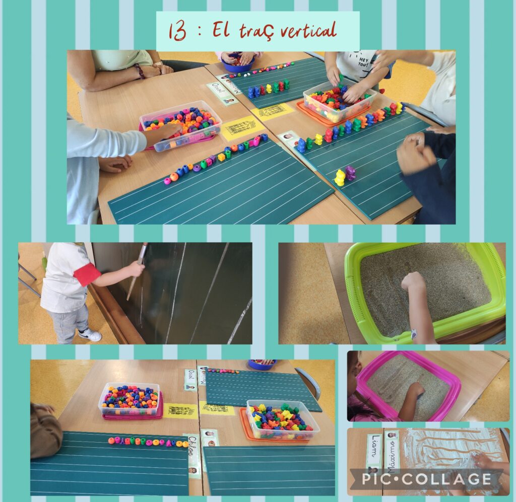 A I3, estem treballant diferents conceptes amb material manipulatiu. Hem treballat el traç horitzontal, hem jugat amb els reglets a