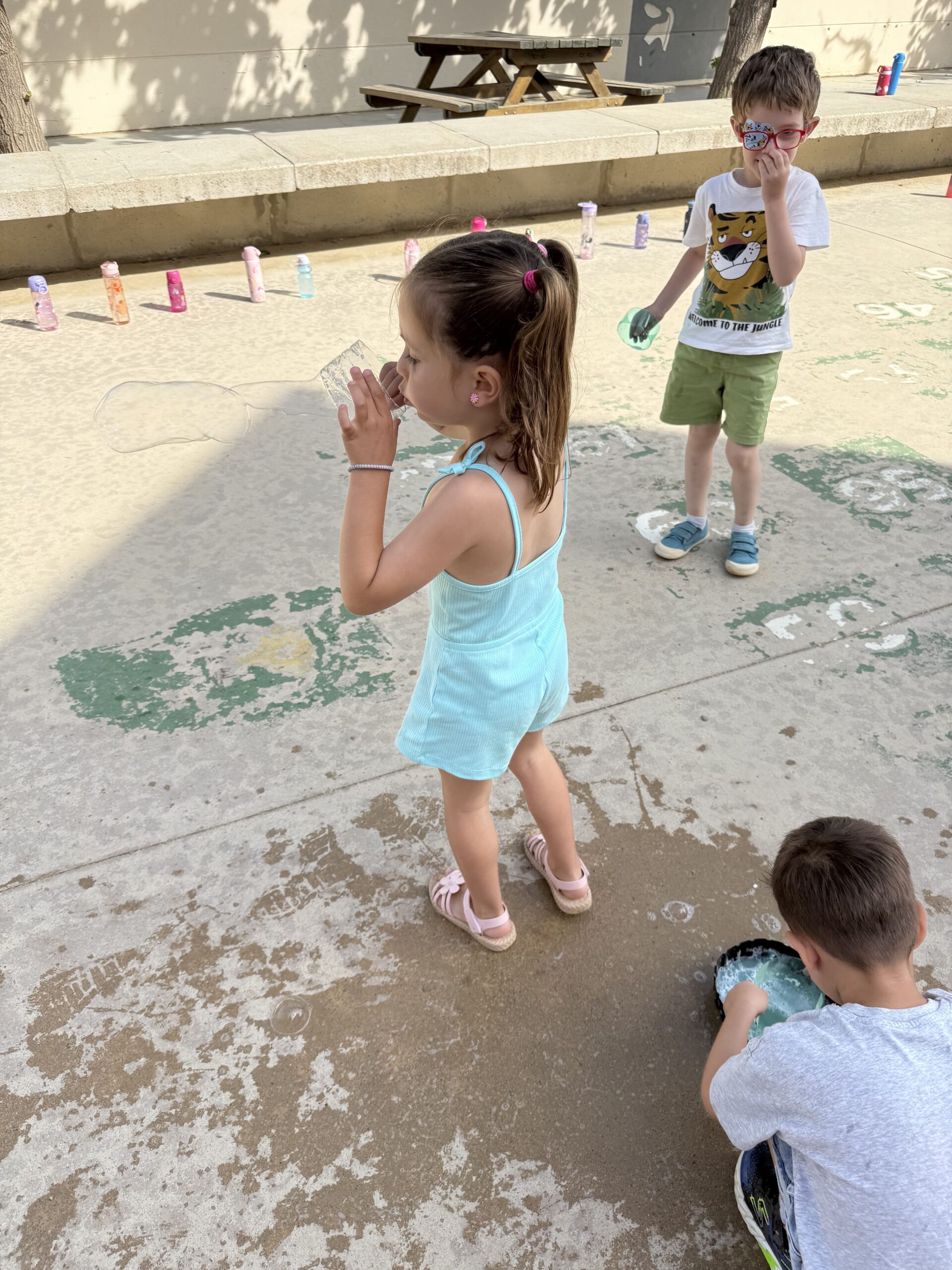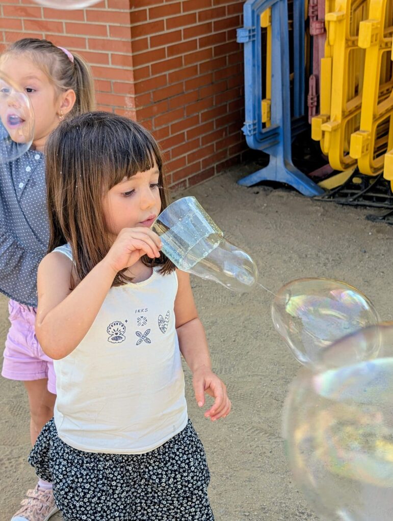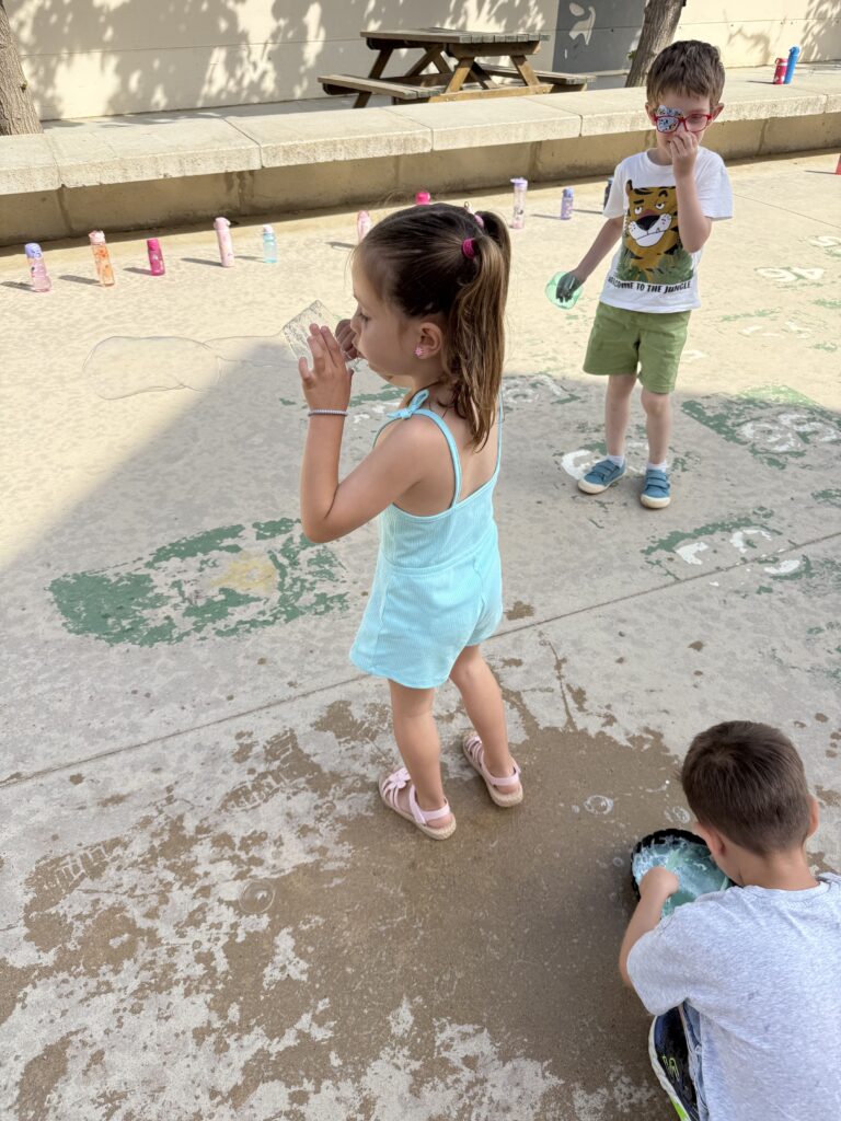 Amb diferents estris i tècniques, hem pogut experimentar amb bombolles de totes mides: petites, gegants, rodones, allargades… Algunes volaven ben amunt, d’altres explotaven de seguida, i d’altres ens envoltaven i ens refrescaven!