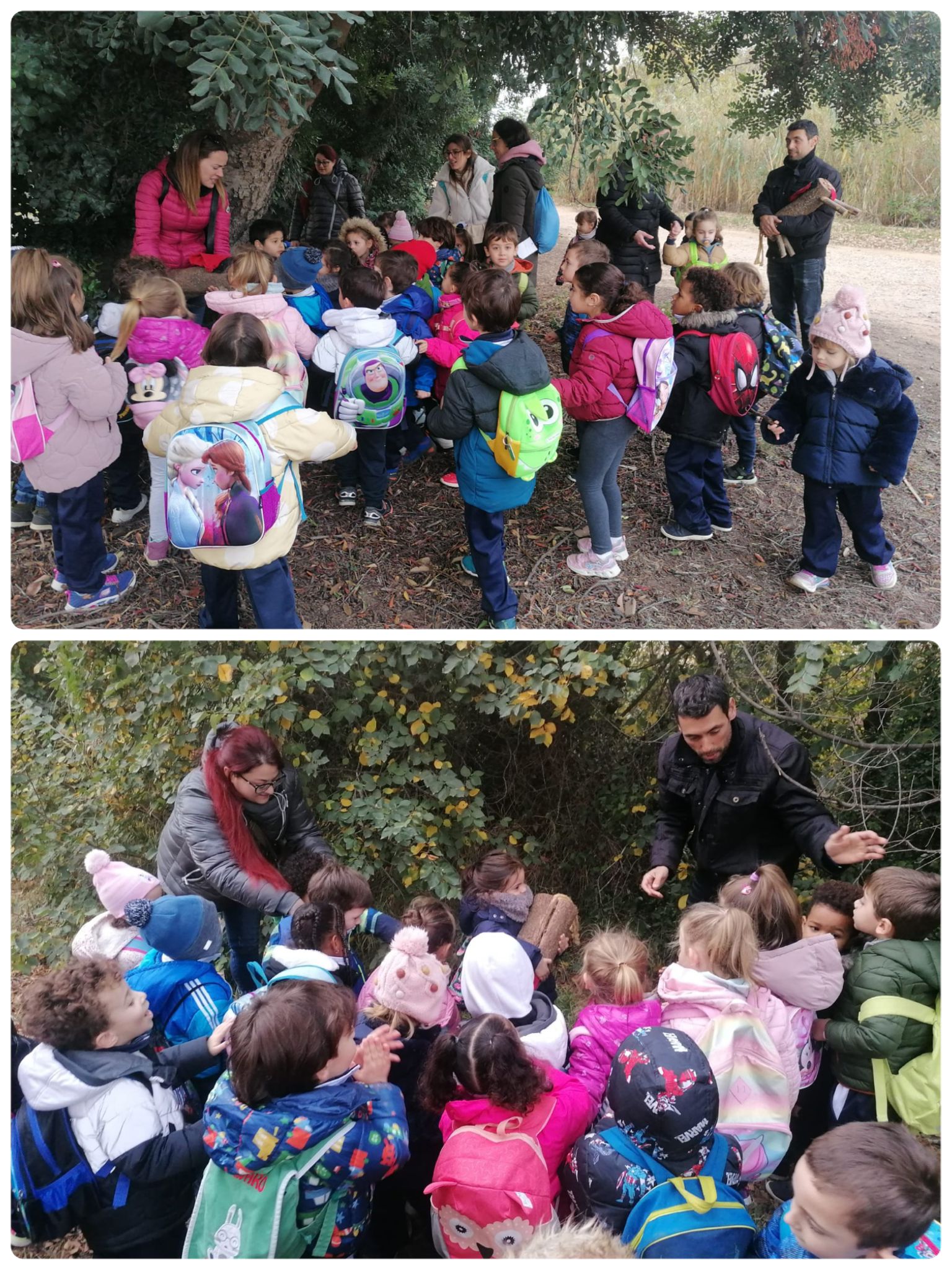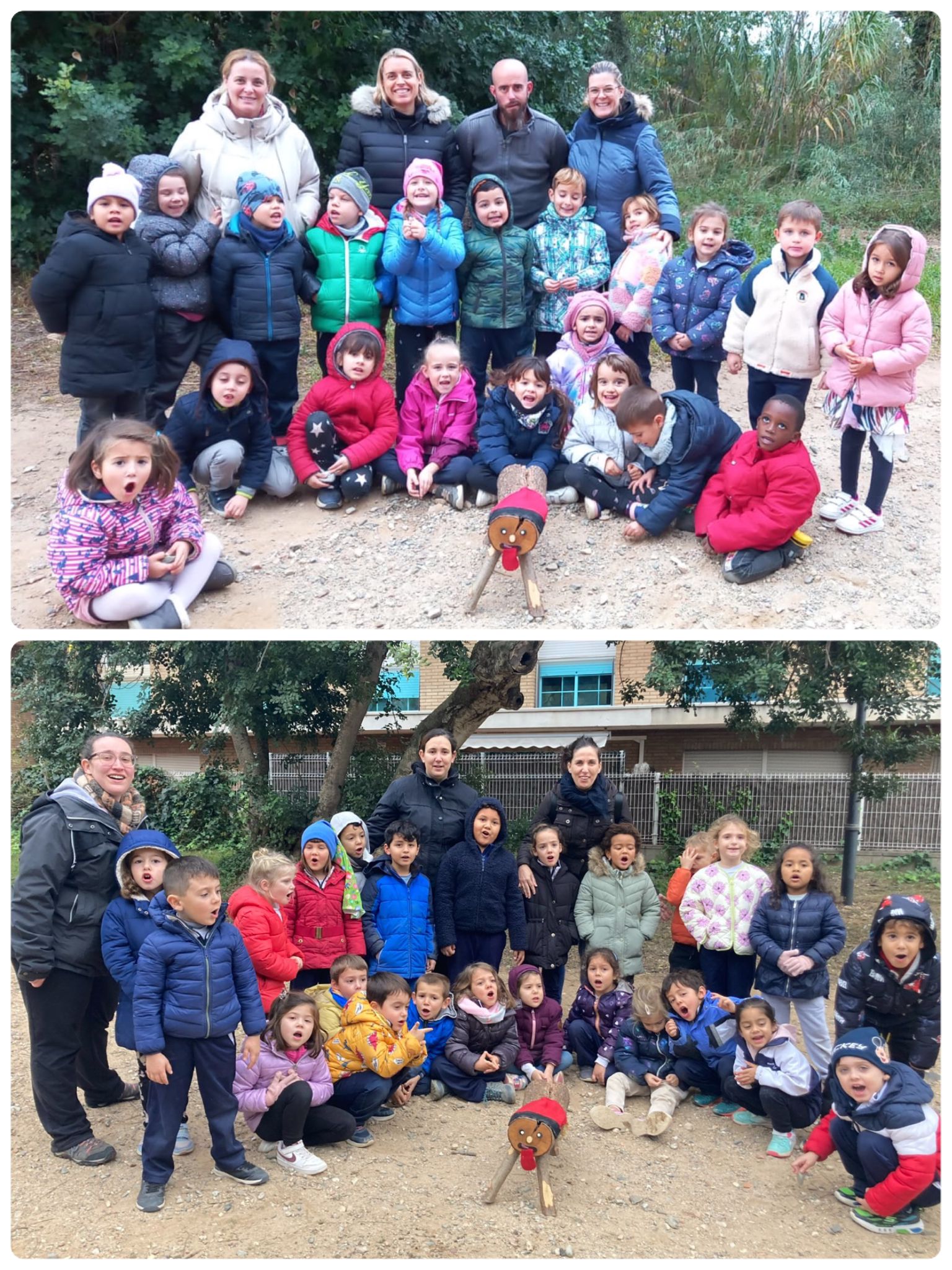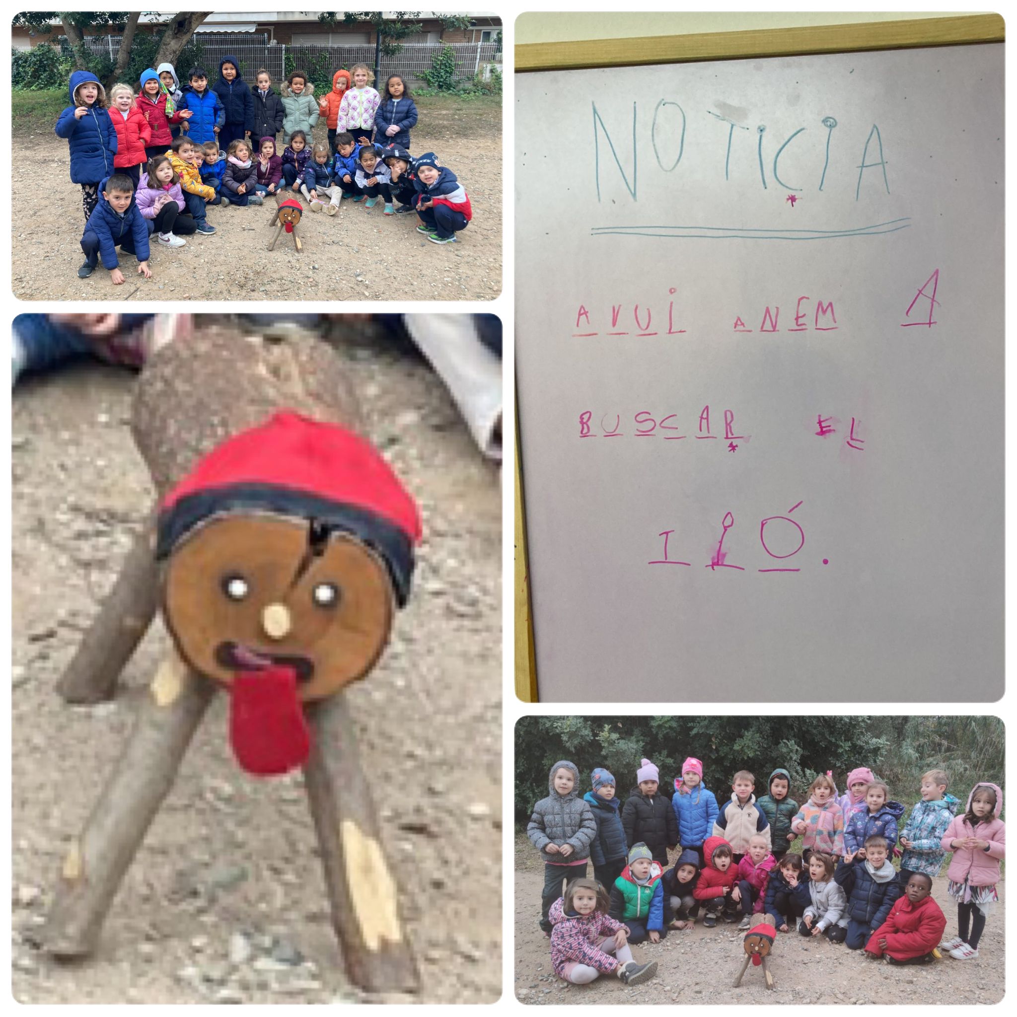 A I4, vam anar a buscar el Tió per la zona de la riera. Quan anàvem caminant, ens vam trobar petjades del Tió. Vam seguir-les fins que el vam trobar! QUINA EMOCIÓ! Després vam aprofitar per esmorzar amb el Tió i jugar una estona al parc.