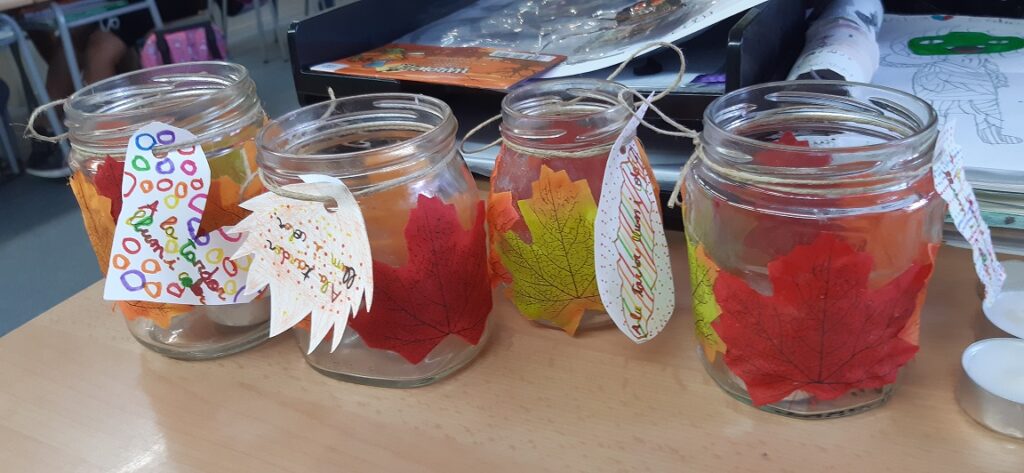 • Bonica manualitat de tardor amb un pot reciclat al que li vam donar un molt bon ús. Unes fulles, un cordillet amb una etiqueta i una espelma… senzill i amb un resultat fantàstic. Amb les disfresses de Halloween estaven ben divertits. Veieu l’àlbum “Manualitat”.