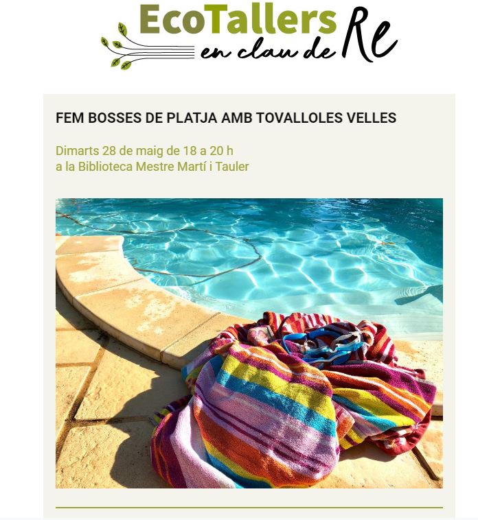 15/05/24Vine a aprendre a transformar tovalloles velles en bosses per a la platja i la piscina, tot ajudant a reduir els residus tèxtils!