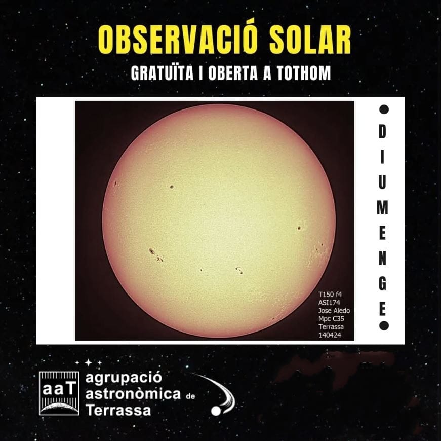 14/01/25L’Agrupació Astronòmica de Terrassa (AAT) us convida al primer diumenge solar de 2025. Podreu observar el Sol i veure una demostració d’energies renovables solar i fotovoltaica, a més de gaudir d’una xocolatada solar calenta. L’activitat està supeditada a l’estat del cel, si us plau, seguiu amb atenció les xarxes socials de l’AAT (Instagram – @aat.terrassa).