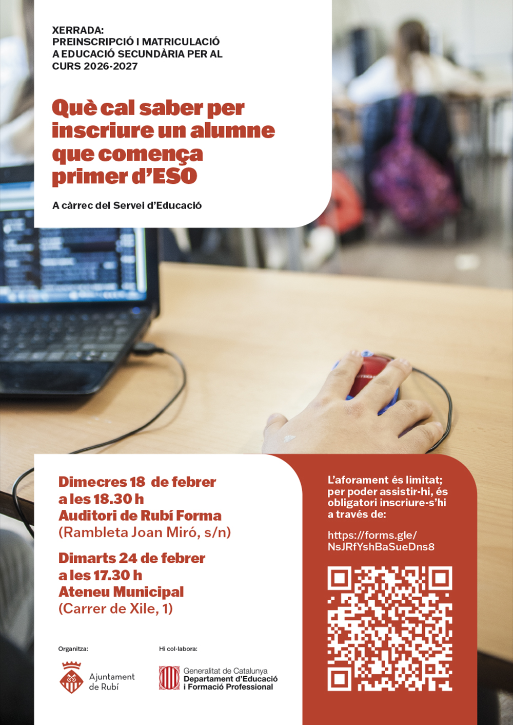 L’aforament és limitat; per poder assistir-hi, és obligatori inscriure-s’hi a través de: https://forms.gle/NsJRfYshBaSueDns8.
