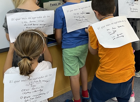 En la segona, “ El que més m’agrada de tu “, els infants portaven a l’esquena un full en blanc amb aquesta frase i la resta de companys/es anaven escrivint qualitats positives de cadascun d’ells/es.
