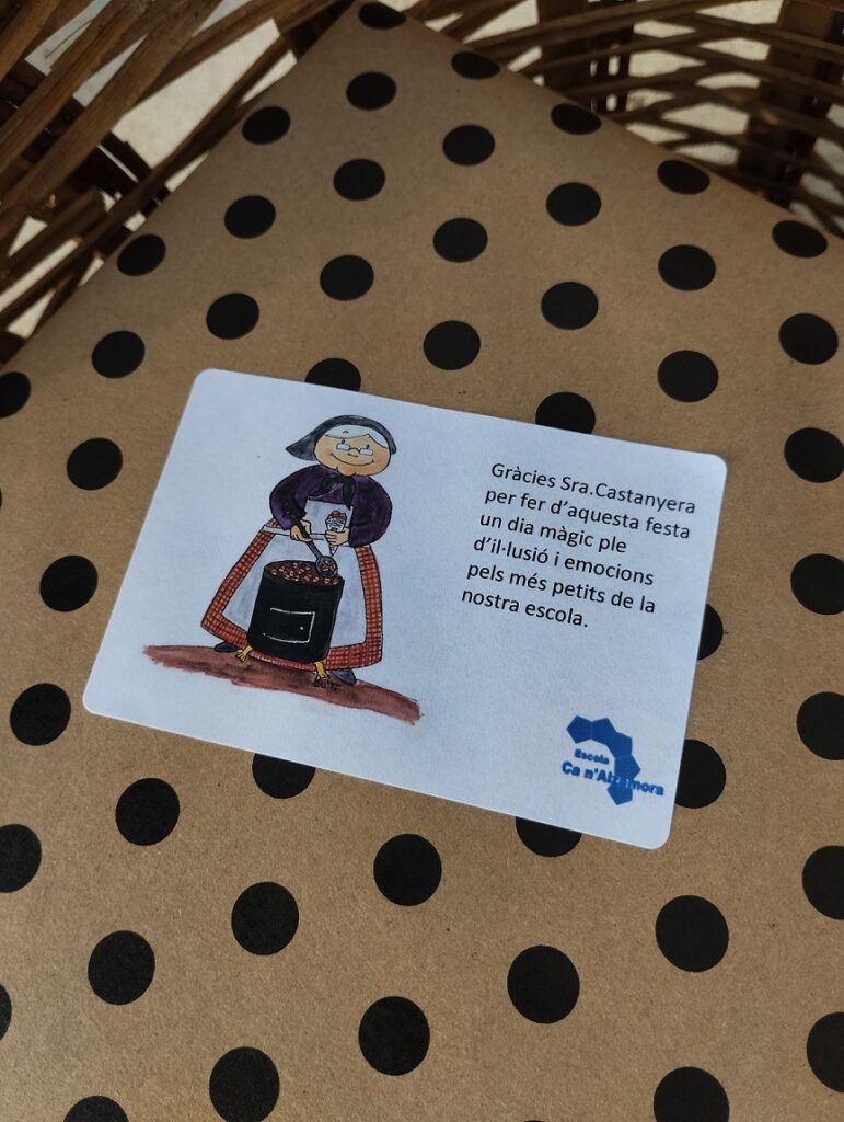 04/11/24El passat dijous, els infants d’educació Infantil i Cicle inicial van rebre la visita de la Sra. castanyera. Estaven molt emocionats. Li van cantar cançons, li van ballar i, sobretot, van ajudar-la a trobar les castanyes perdudes! Fent clic a la imatge trobareu els àlbums “Festa de la castanyada” i “Visita de la castanyera a Cicle inicial” a l’apartat de Fotos/activitats conjuntes.