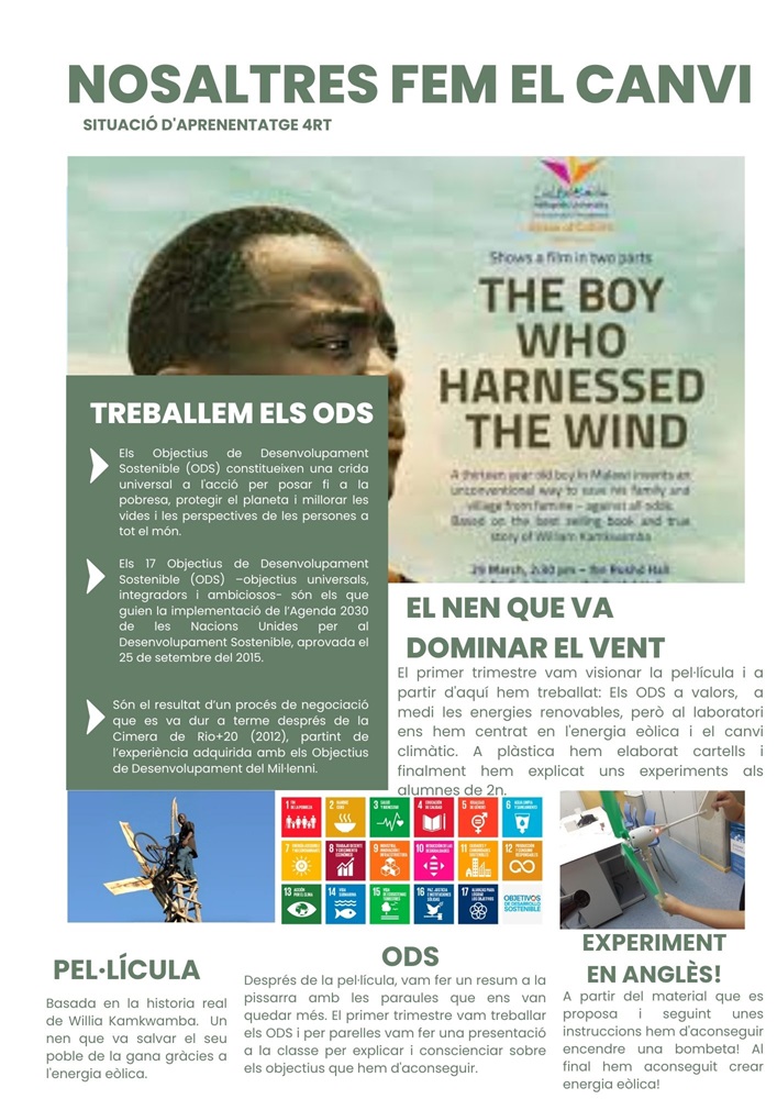 Una de les línies de treball ha estat l’energia sostenible, i per això hem aprofundit en l’energia eòlica: hem construït molins de vent i hem conegut la història real de “El niño que domó el viento”, una pel·lícula que ens ha ajudat a entendre el poder del coneixement, la creativitat i la perseverança per millorar el món.