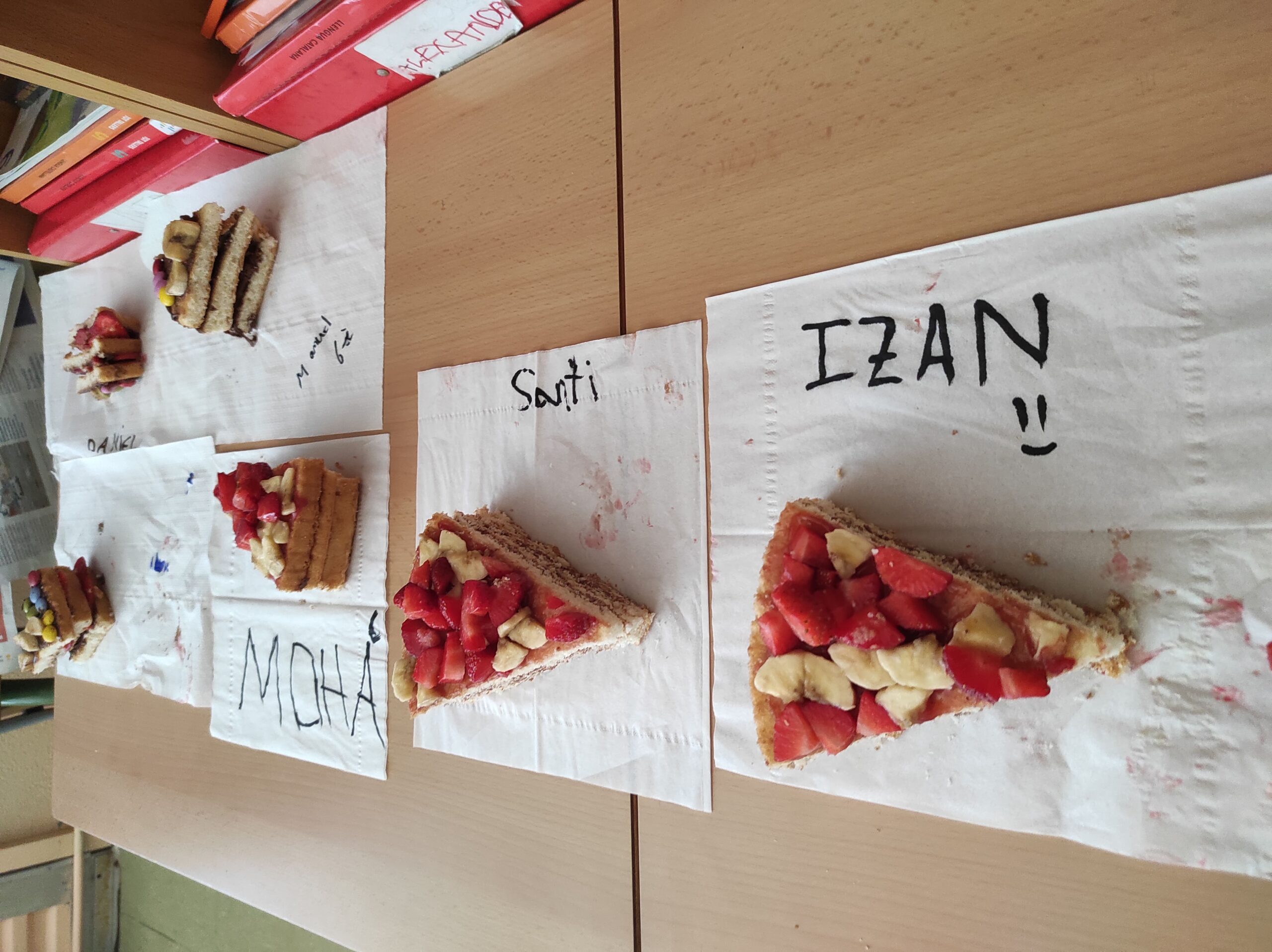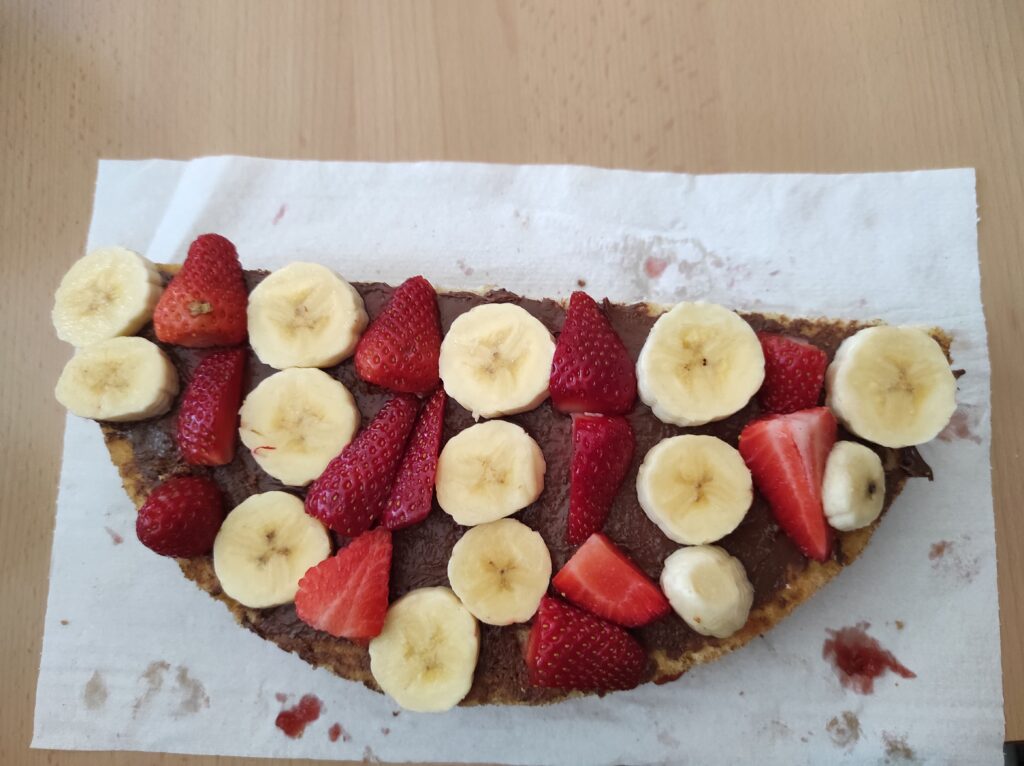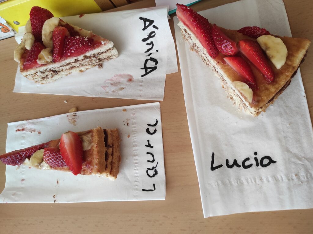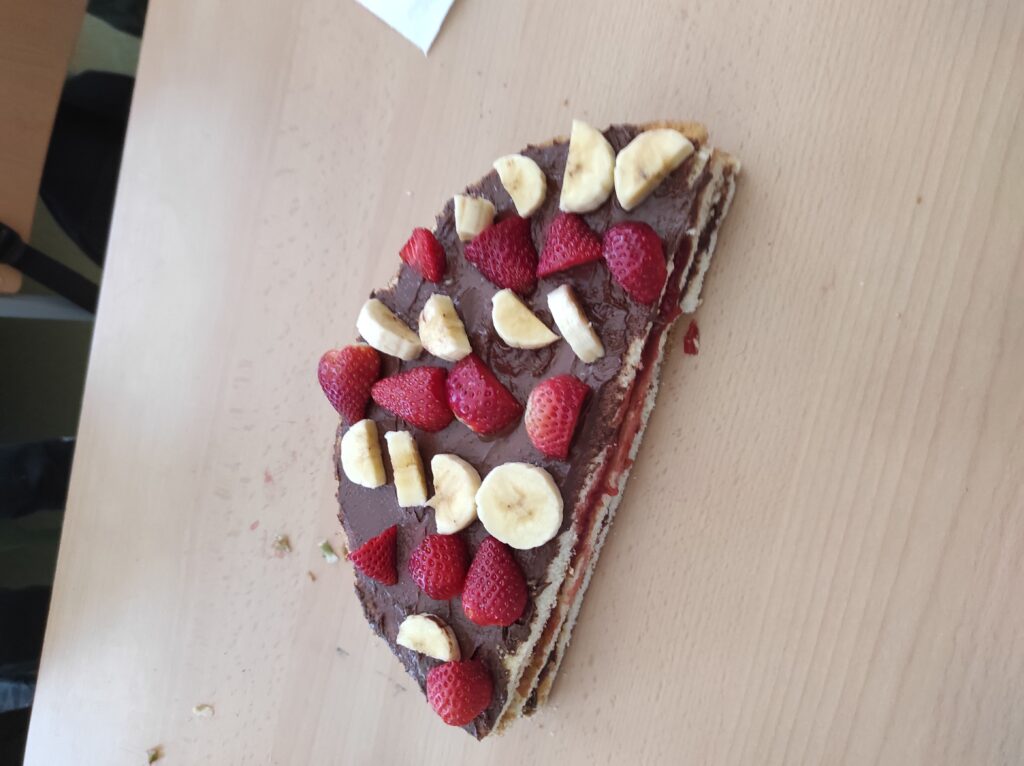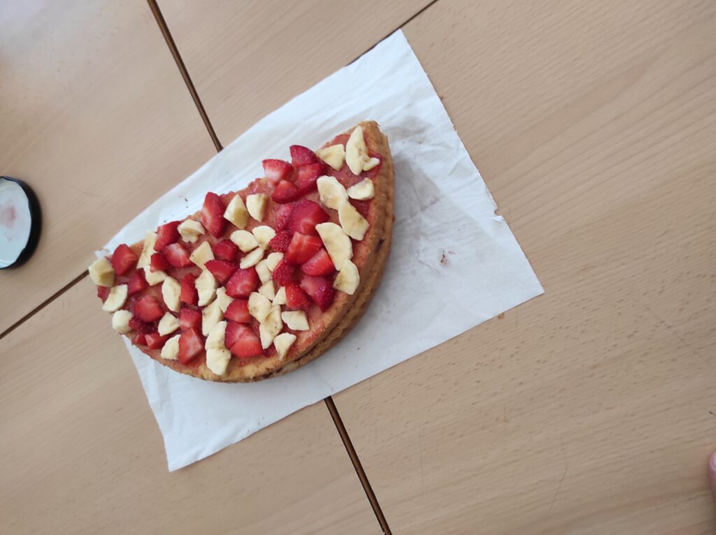 Avui per Sant Jordi a la colla de grans hem començat amb dos tallers de cuina: un de postres, on hem fet un pastís amb xocolata per dins i amb la bandera catalana per fora feta amb maduixes i plàtans i una torrada de Sant Jordi amb formatge i sobrassada.
