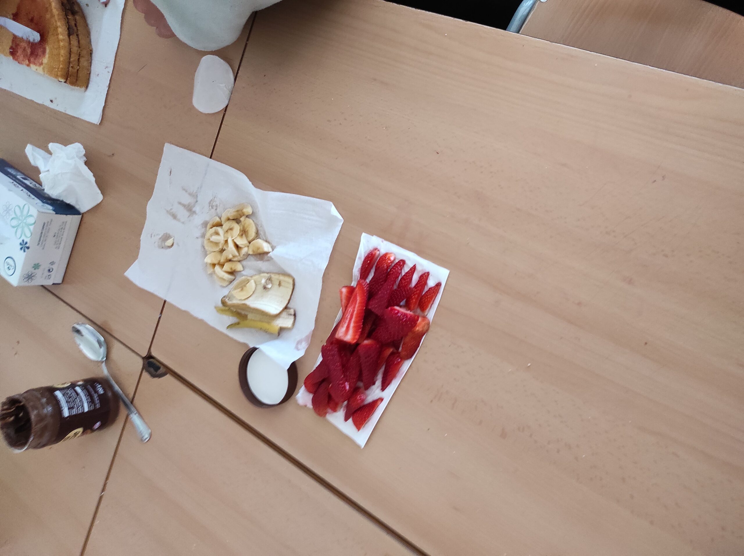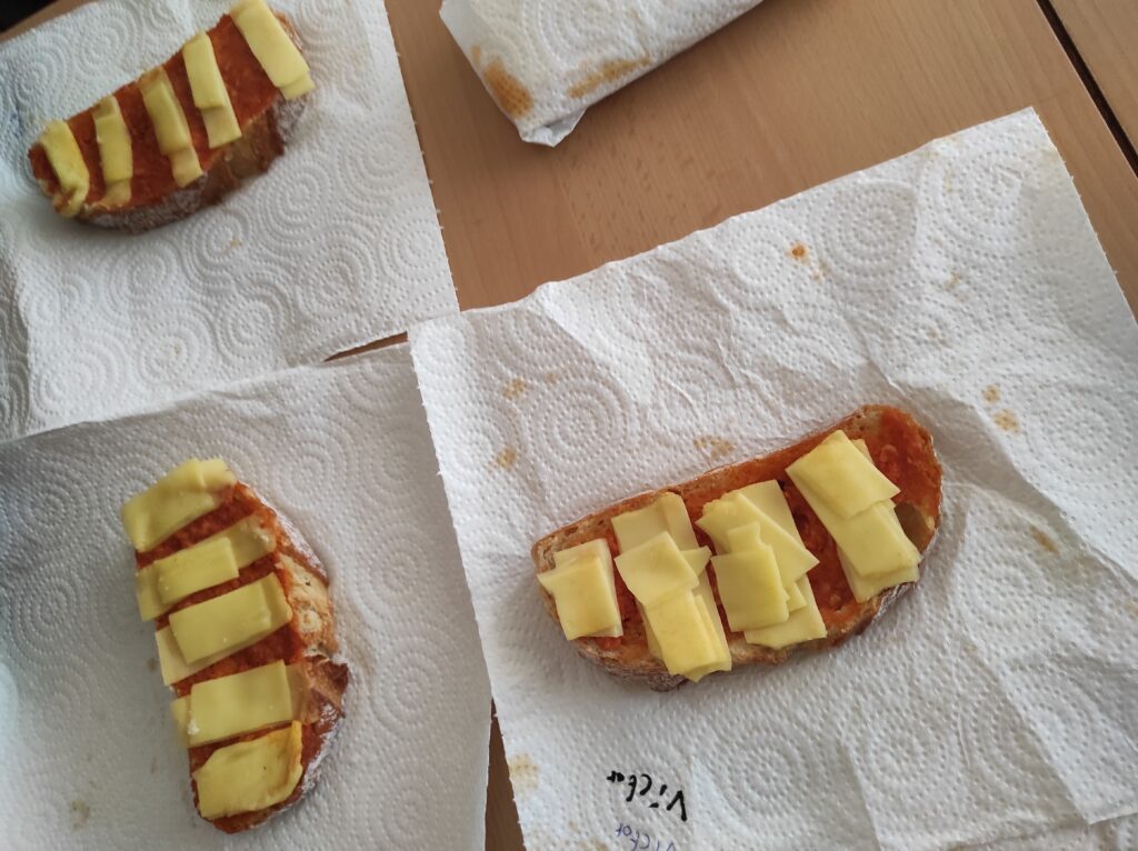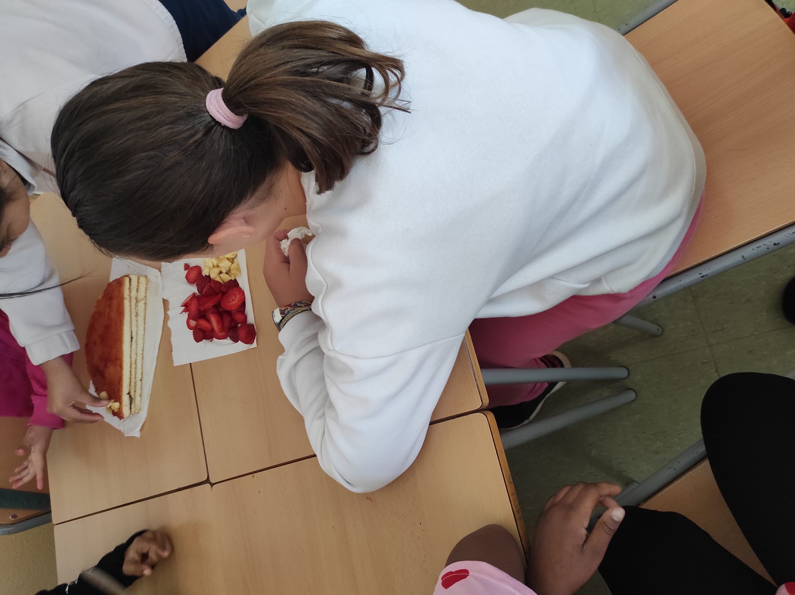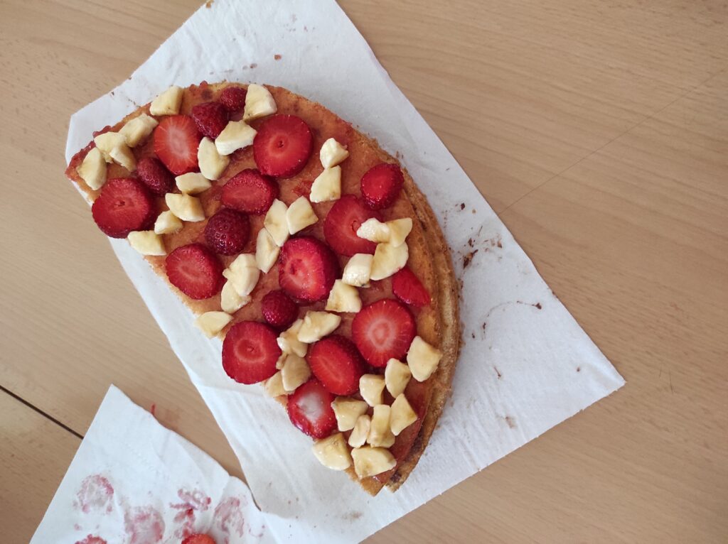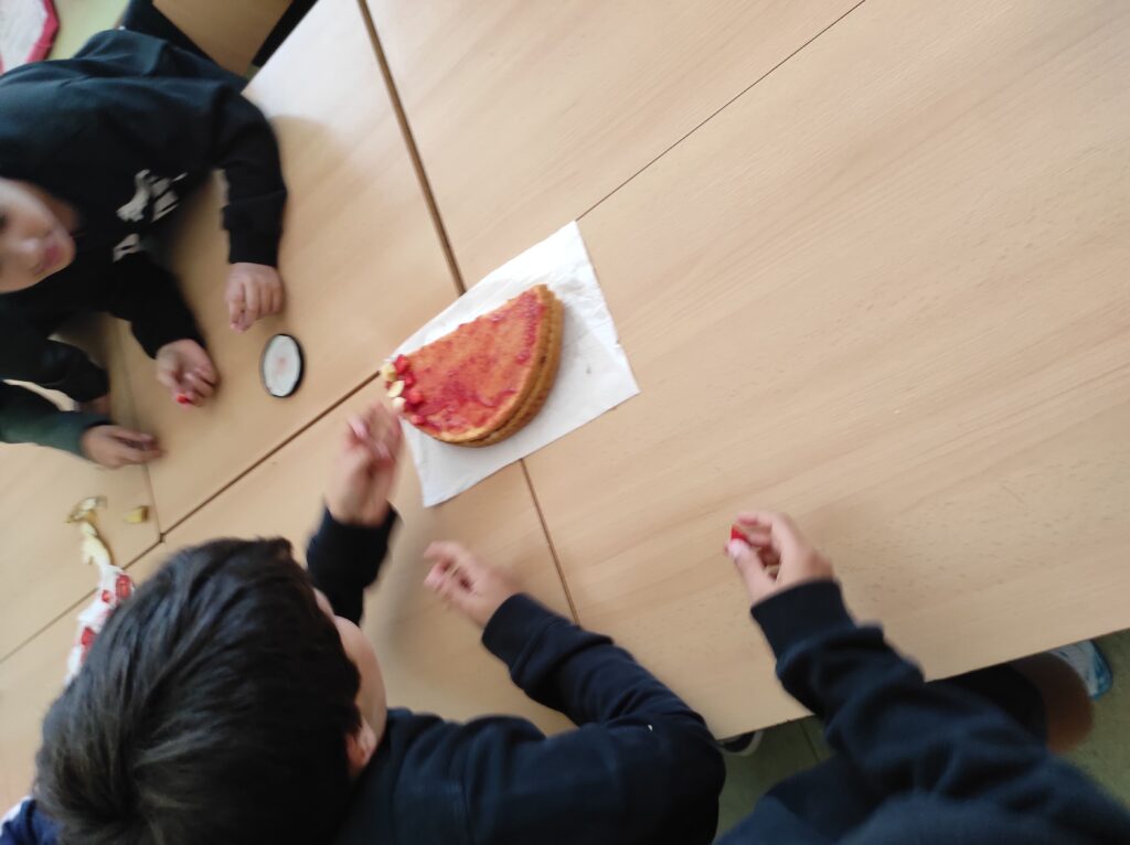 Avui per Sant Jordi a la colla de grans hem començat amb dos tallers de cuina: un de postres, on hem fet un pastís amb xocolata per dins i amb la bandera catalana per fora feta amb maduixes i plàtans i una torrada de Sant Jordi amb formatge i sobrassada.
