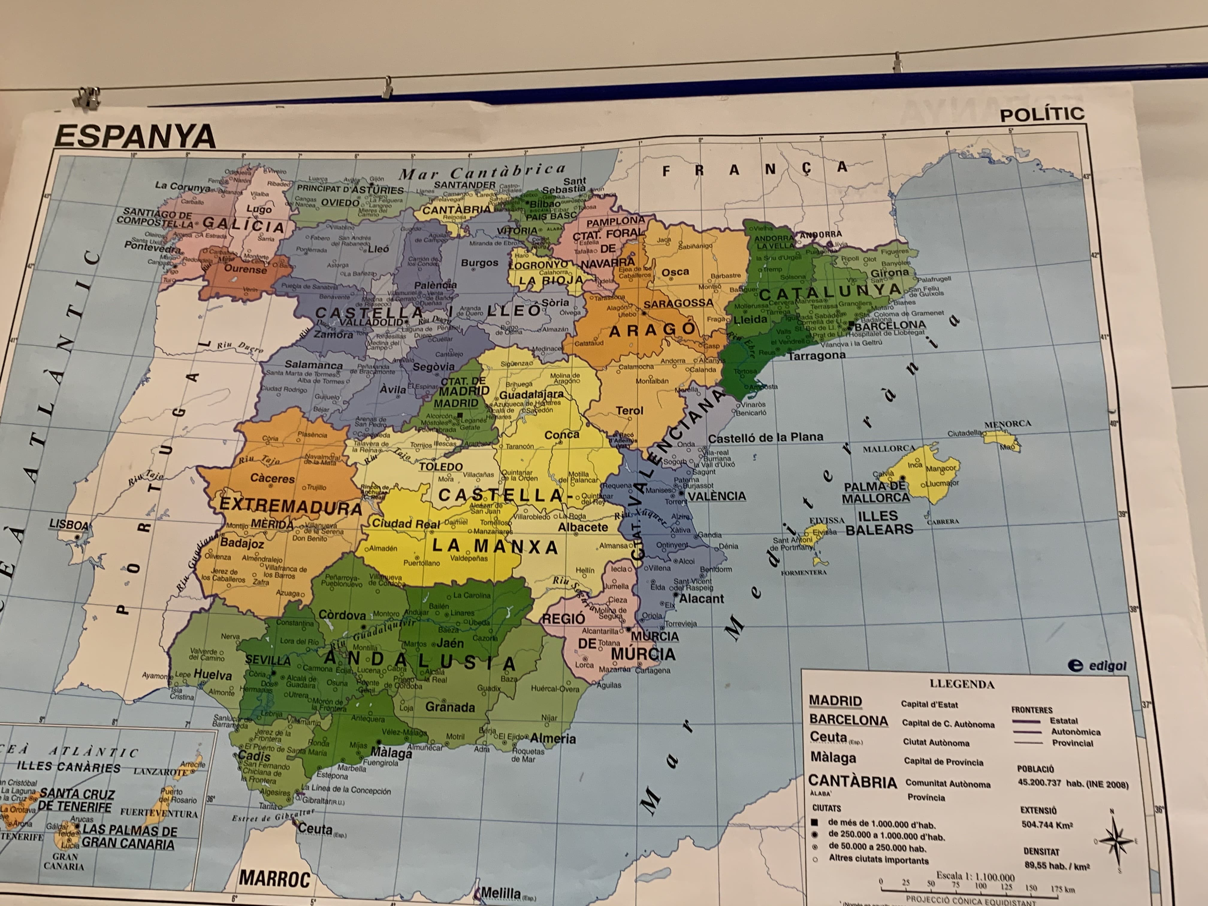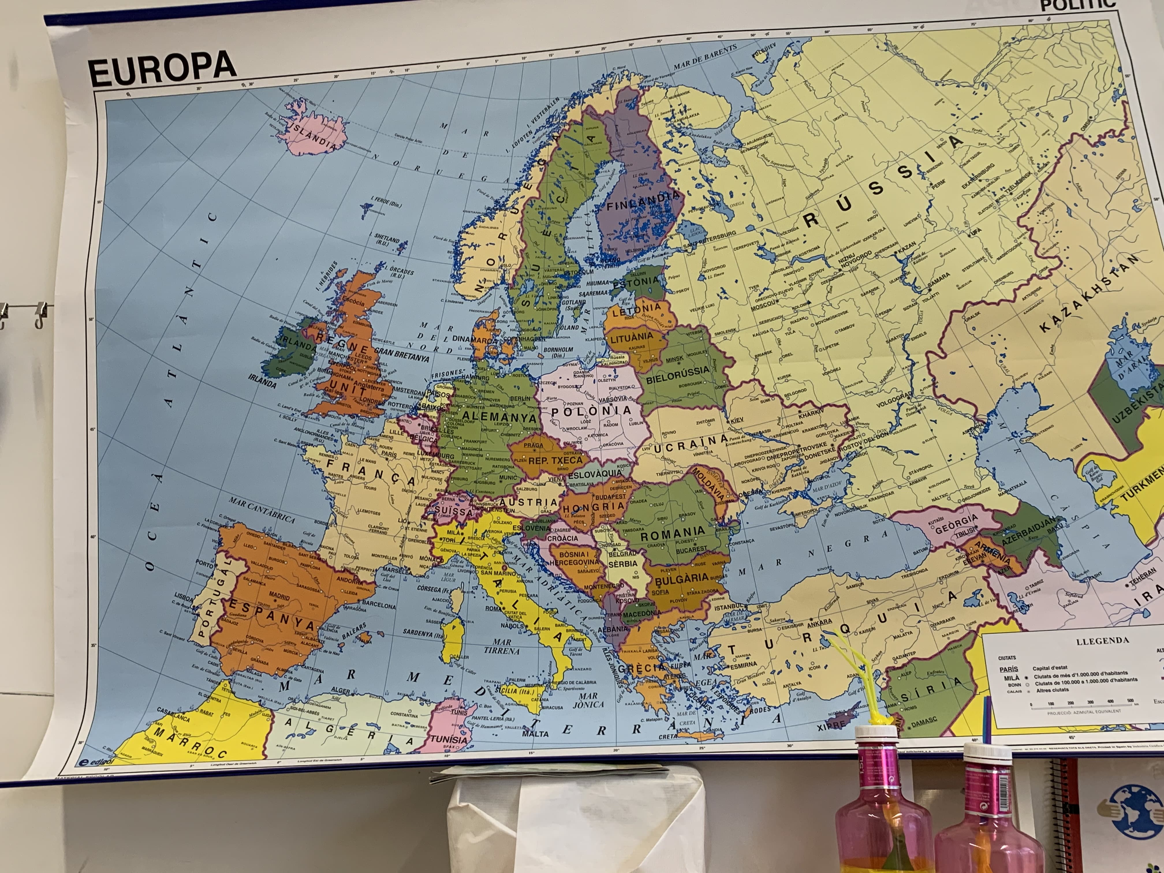 Tenim uns mapes molt bonics penjats a la classe que per un costat hi ha el mapa polític (el que posa els noms dels països), i per l’altra banda el físic (que surten les muntanyes, i no hi ha noms).