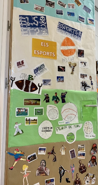 DESPRÉS D’UNS DIES DE FEINA, JA TENIM ACABADA LA PORTA DE LA CLASSE. COM QUE SOM LA CLASSE DELS ESPORTS HEM OMPLERT LA PORTA AMB DIBUIXOS D’ESPORTISTES, ESPORTS I PILOTES DE DIFERENTS TIPUS. VAN DECIDIR POSAR DIFERENTS COLORS A LA PORTA DEPENEN DEL LLOC ON ES DESENVOLUPA L’ESPORT: MARRÓ ( TERRA), BLANC ( GEL, NEU),VERD( GESPA), BLAU ( AIRE, AIGUA), I PER FINALITZAR HEM POSAT TRES TÍTOLS.