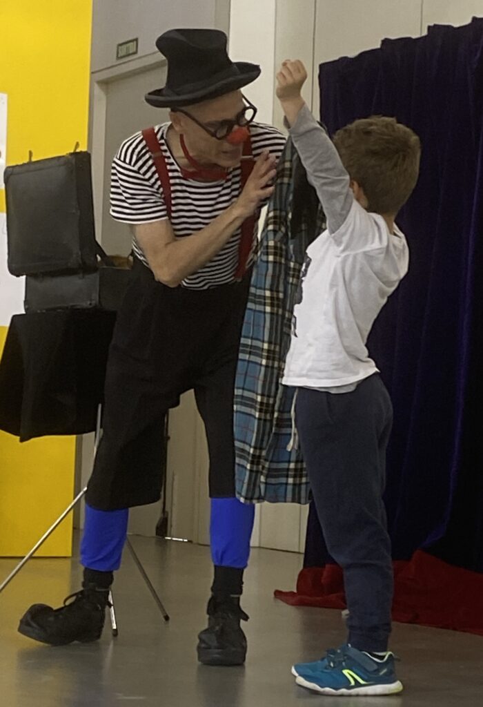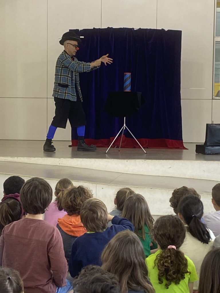 Aquesta setmana, l’alumnat i mestres de cicle inicial hem gaudit d’una obra teatral en anglès de la mà d’en Ruskus Patruskus, un pallasso que ens ha fet riure molt, gràcies a les seves habilitats per fer màgia.