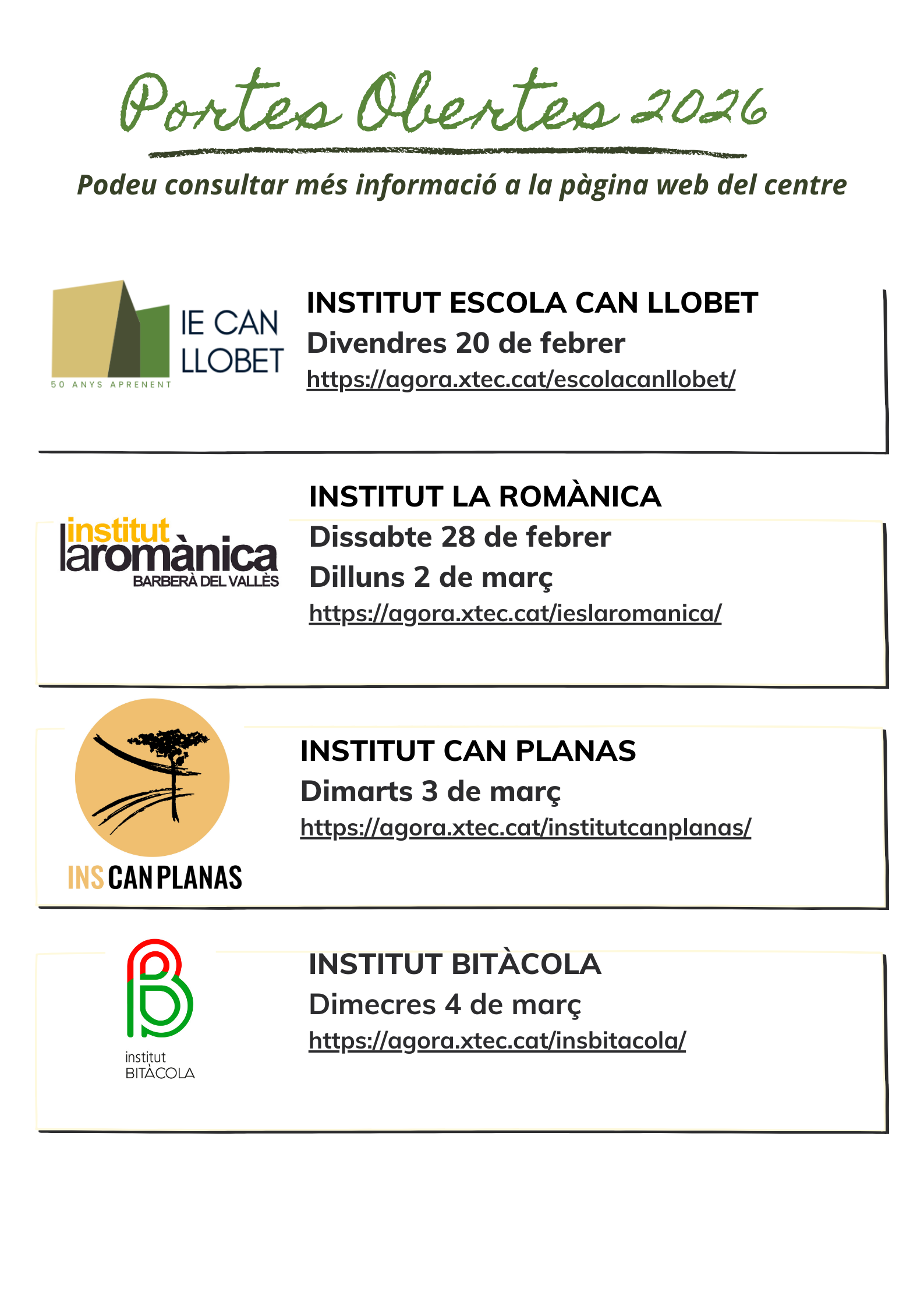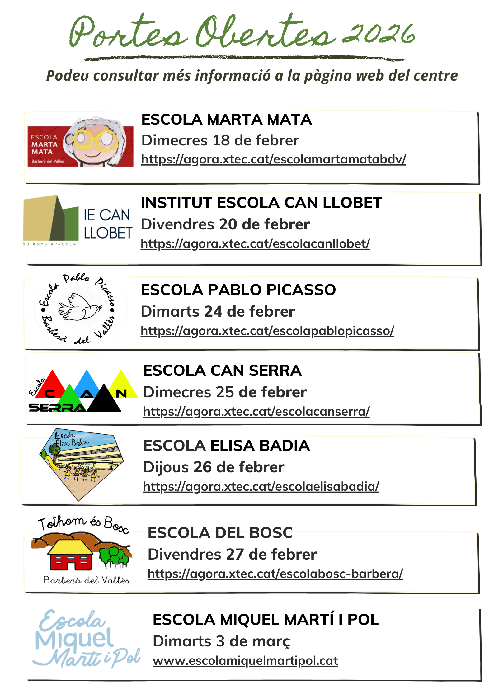 Preinscripció Curs 2026-2027 Escola26/01/26 Calendari de presentació de sol·licituds per a la preinscripció del curs 2026-2027. Portes Obertes de les escoles i instituts de Barberà del Vallès: