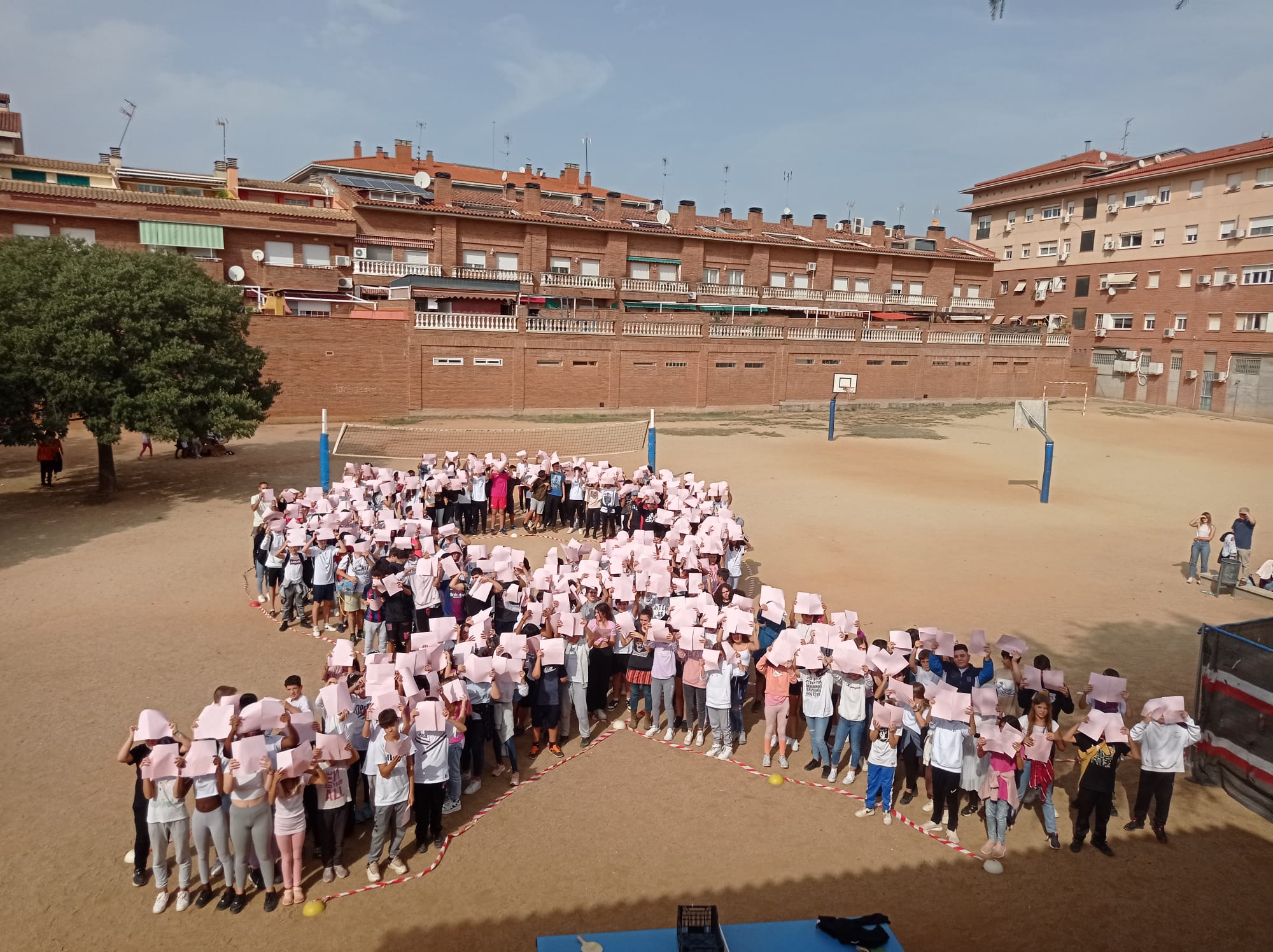 tot l’alumnat d’ESO. La més espectacular, un llaç humà llegant al pati de color rosa, representatiu