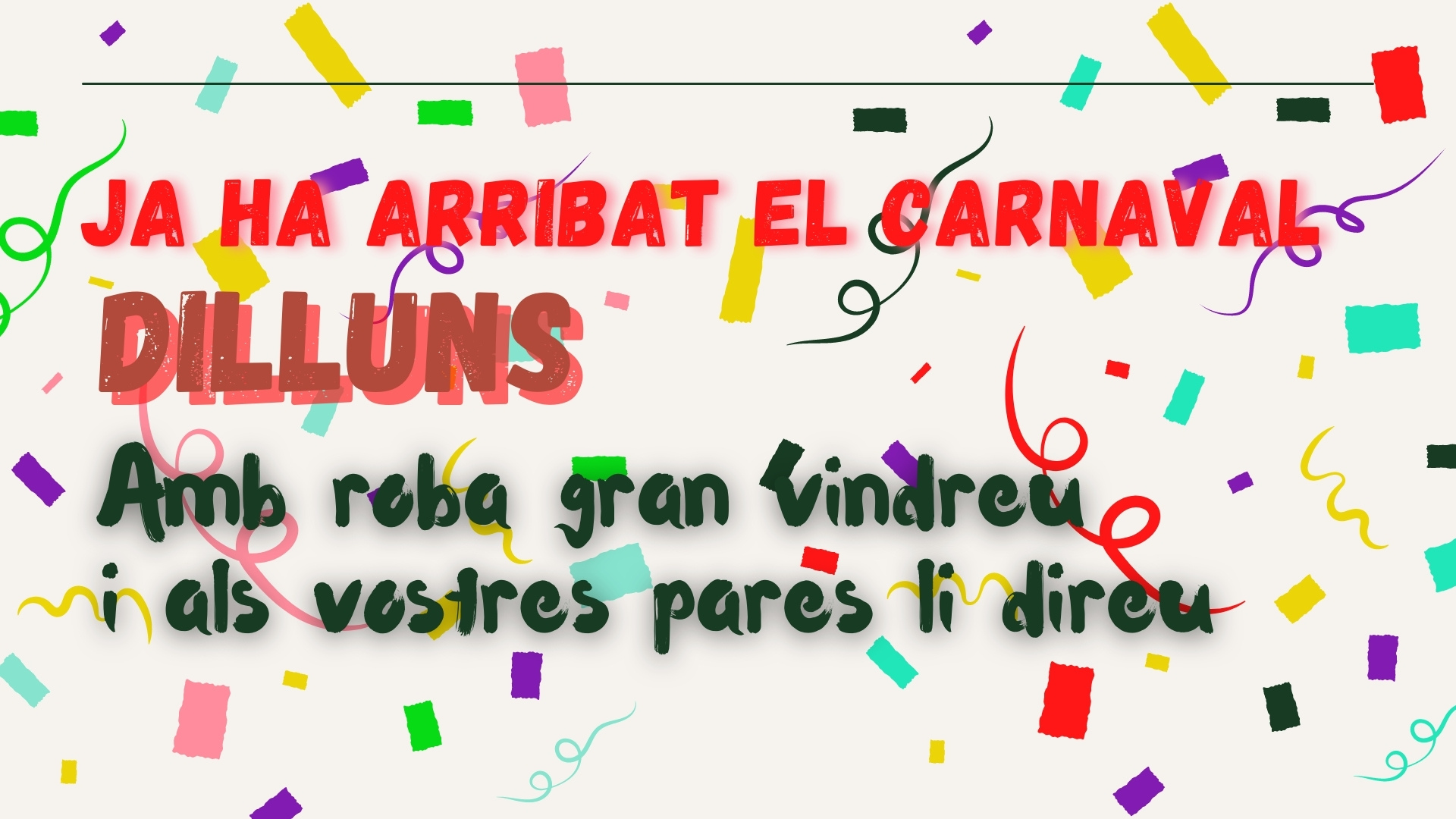 El senyor Carnestoltes com cada any ens dona unes ordres per complir-les al llarg de la setmana vinent.El  dilluns hem de venir vestit amb roba gran dels nostres pares o mares.  Trobareu cada dia les ordres escrites a les portes de l’escola.Comença la xerinola!