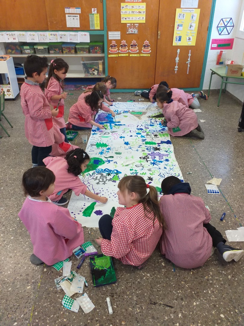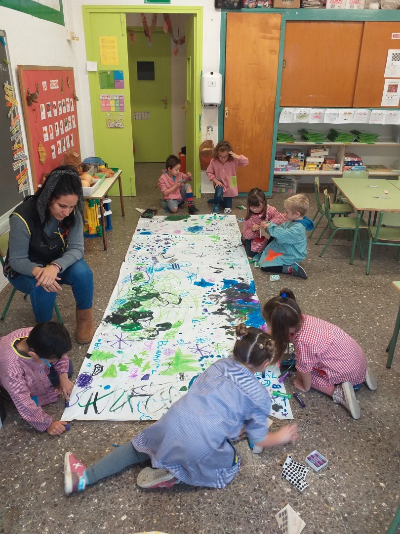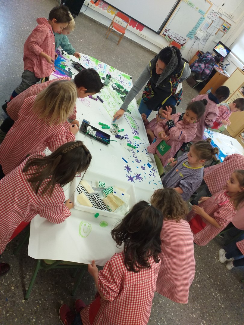 AVUI HEM PINTAT COM ELS ARTISTES, DRETS I AMB UN PINZELL LLARG. HEM UTILITZAT LES OUERES PER FER DE PALETA, TENIEM MOLTS COLORS DIFERENTS, I CADA VEGADA QUE CANVIÀVEM DE COLOR HAVIEM DE RENTAR EL PINZELL EN UN POT AMB AIGUA.