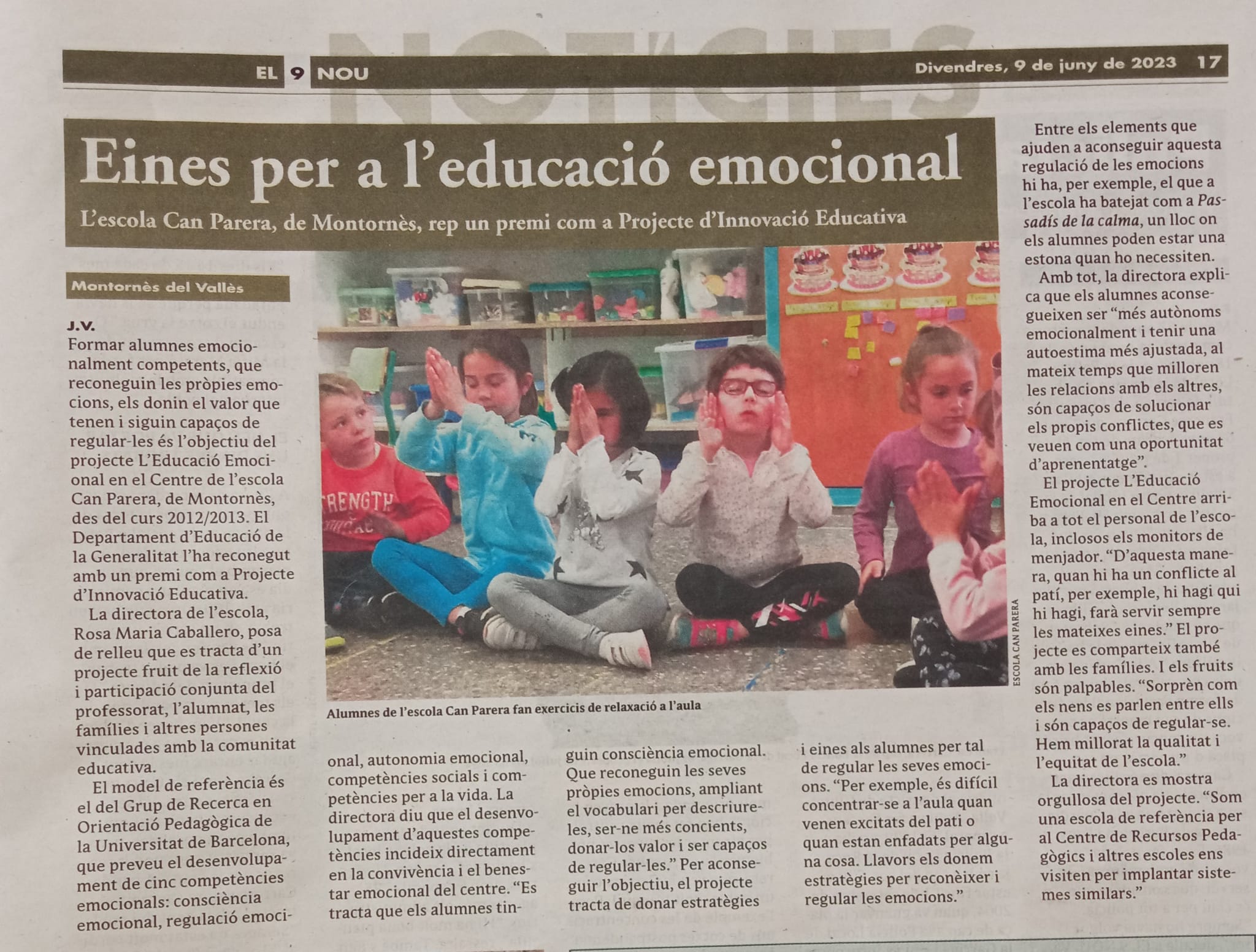 • Vallès Visió 16 de juny de 2023.   El Departament d’Educació reconeix el projecte ‘L’educació emocional en el centre’ de l’escola Can Parera.
