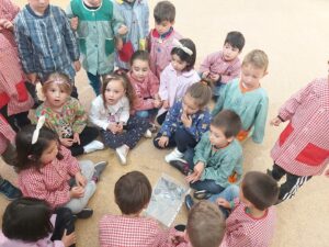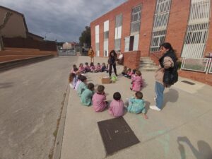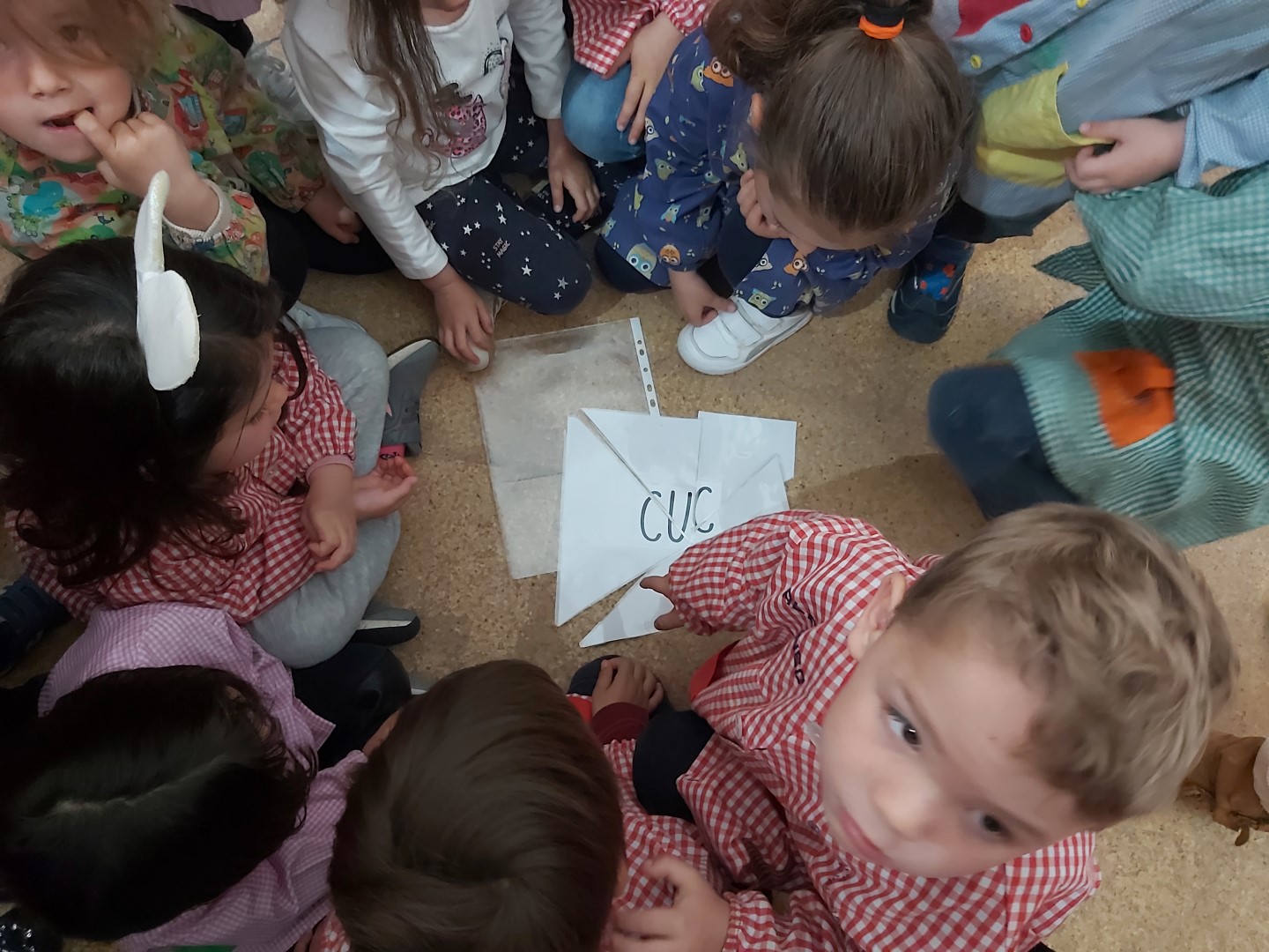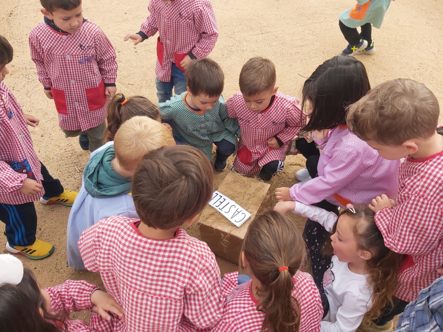 AIXÍ VAM COMENÇAR UNA GIMCANA DE PISTES QUE ENS VA PORTAR AL CUC DEL PATI, AL CASTELL, LA CUINA I L’HORT I ENS VAM ANAR TROBANT DIFERENTS OBJECTES: PALLA, UN BARRET, OUS, UNA GALLEDA, GUANTS I UNA REGADORA.