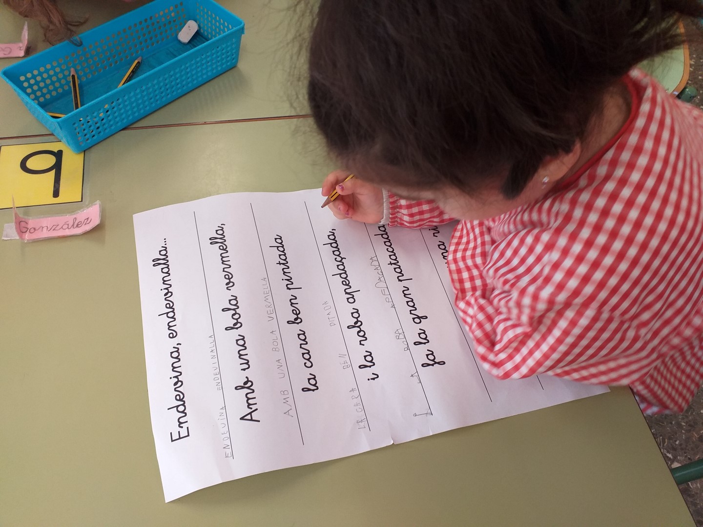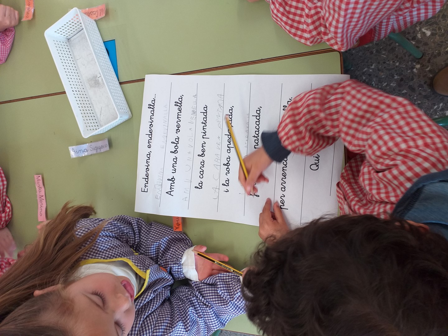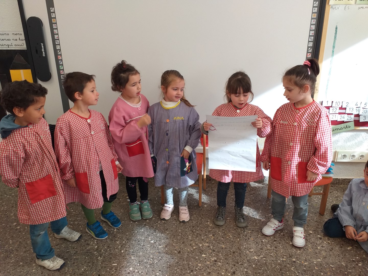 AVUI HEM FET UNA ENDEVINALLA PERÒ D’UNA MANERA DIFERENT.  HEM FET EQUIPS DE TREBALL I ENTRE TOTS HAVIEN D’INTENTAR TRANSCRIURE DE LLETRA LLIGADA  A LLETRA DE PAL LES FRASES DE L’ENDEVINALLA, LLEGIR-LA I INTENTAR ENDEVINAR QUÈ ERA!  DESPRÉS HEM SORTIT PER GRUPS A LLEGIR I EXPOSAR EL QUE CADASCÚ CREIA QUE PODIA SER.  HA SIGUT MOLT DIVERTIT I AL FINAL HO HEM ENDEVINAT!!!