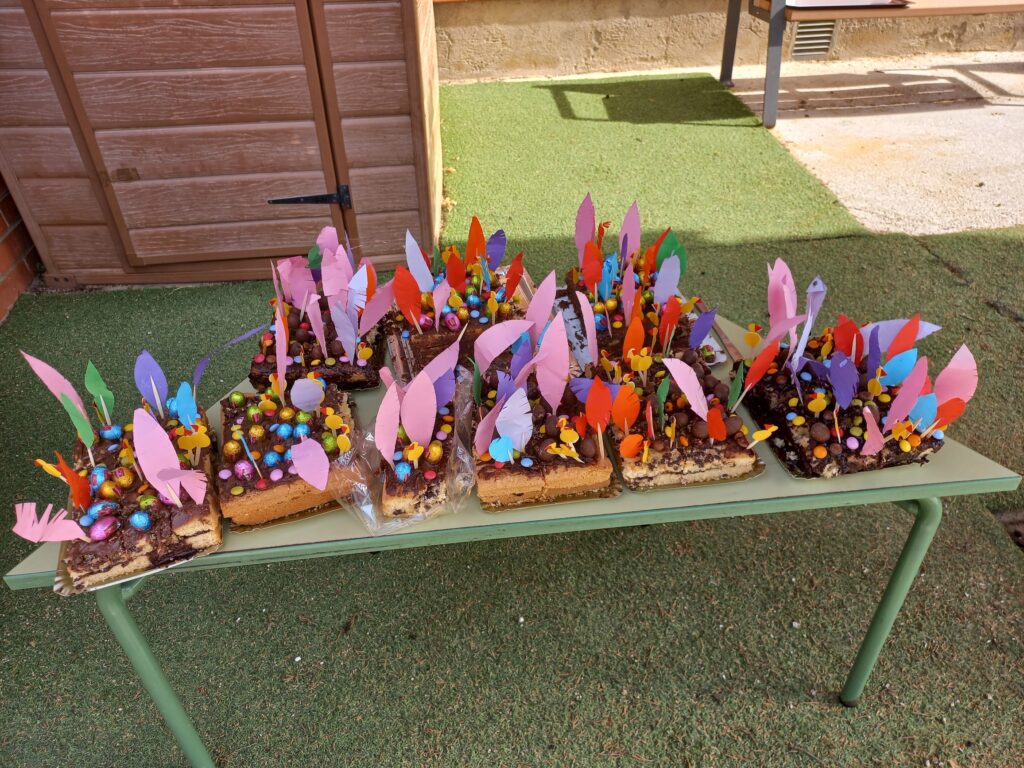 DIMARTS VAM CELEBRAR LA MONA AMB TOT EL CICLE D’EDUCACIÓ INFANTIL. CADA CLASSE VAM FER LA NOSTRA MONA AMB PÀ DE PESSIC, XOCOLATA DESFETA, OUS DE XOCOLATA I LACASITOS. I PER DECORAR LI VAM POSAR PLOMES I POLLETS QUE VAM FER NOSALTRES AMB FULLS DE COLORS I GOMETS!