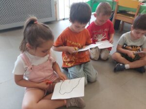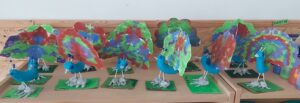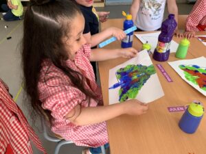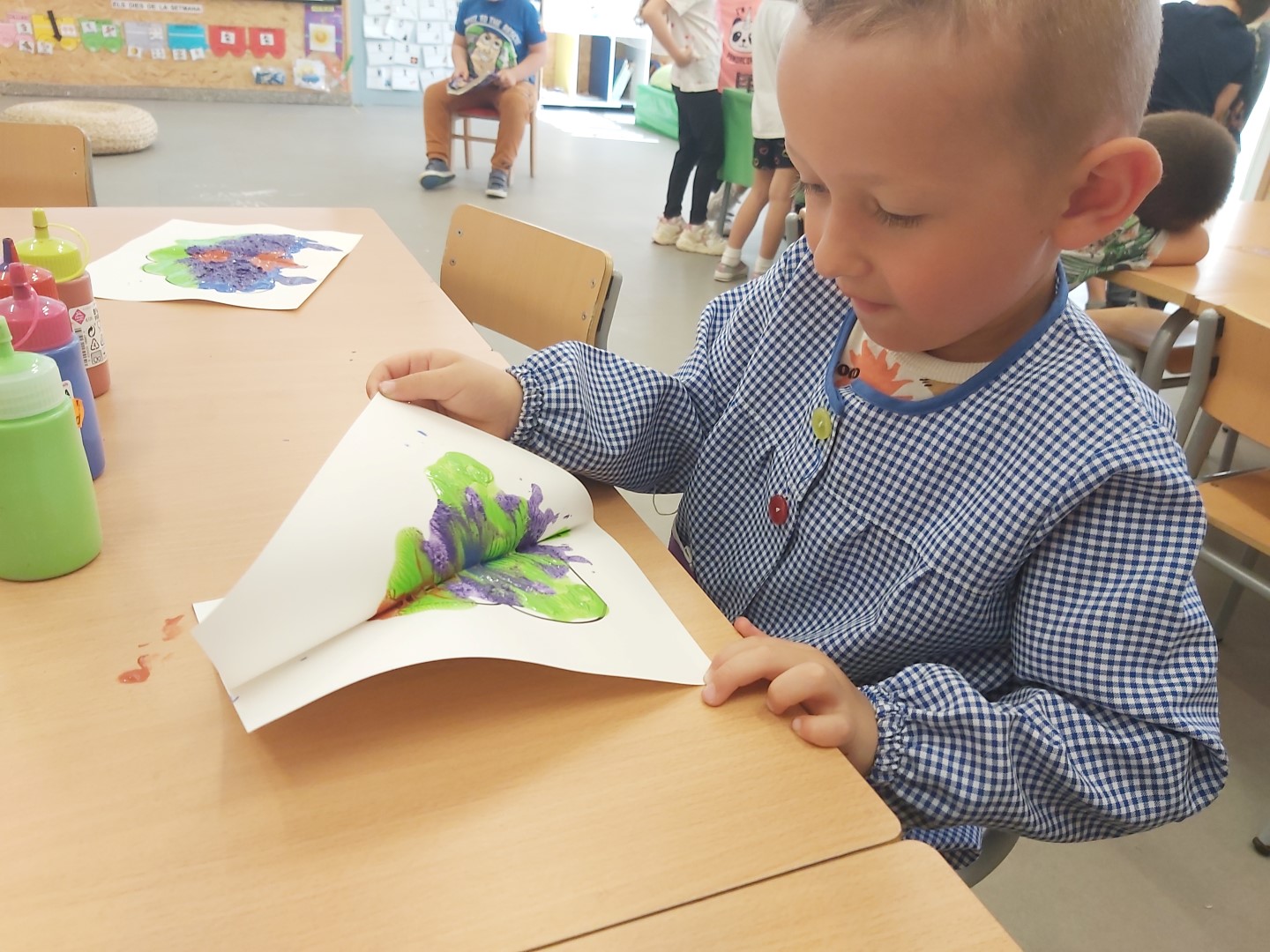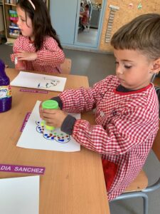 PER FER LA CUA, VAM TREBALLAR L’ESTAMPACIÓ I LA SIMETRIA. VAM PINTAR AMB POTS DE PINTURA FENT CAURE GOTES PETITES A LA MEITAT D’UN FULL QUE TENIA DIBUIXADA LA SILUETA DE LA CUA DEL PAÓ. DESPRÉS VAM DOBLEGAR EL FULL PER LA MEITAT, VAM PRÉMER AMB LES DUES MANS I… MÀGIA, S’HAVIA PINTAT L’ALTRA MEITAT DE LA CUA! QUAN LA PINTURA VA ESTAR SECA, VAM RETALLAR-LA, DOBLEGADA PER LA MEITAT, SEGUINT LA LÍNIA NEGRA DEL CONTORN.