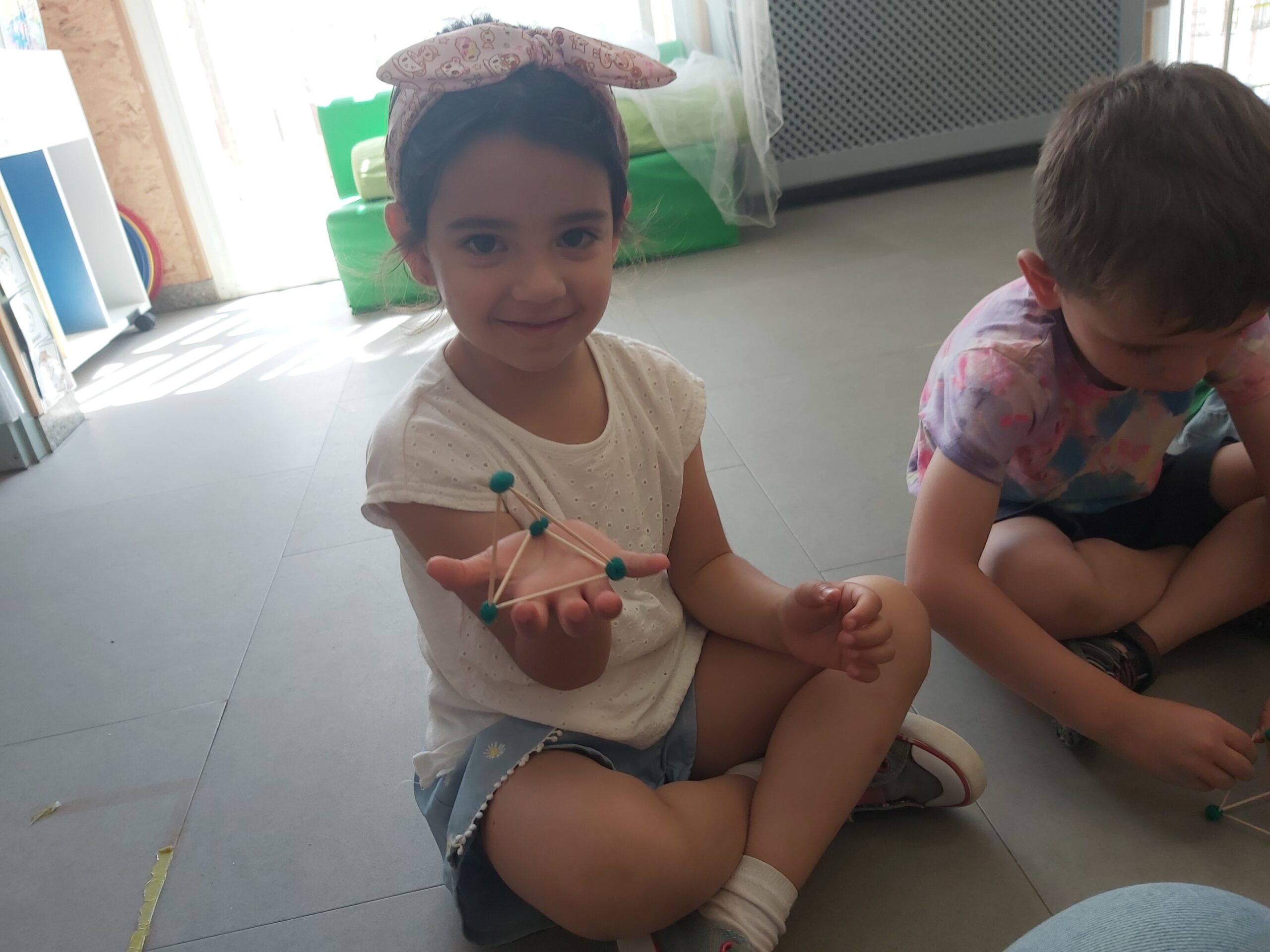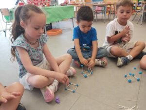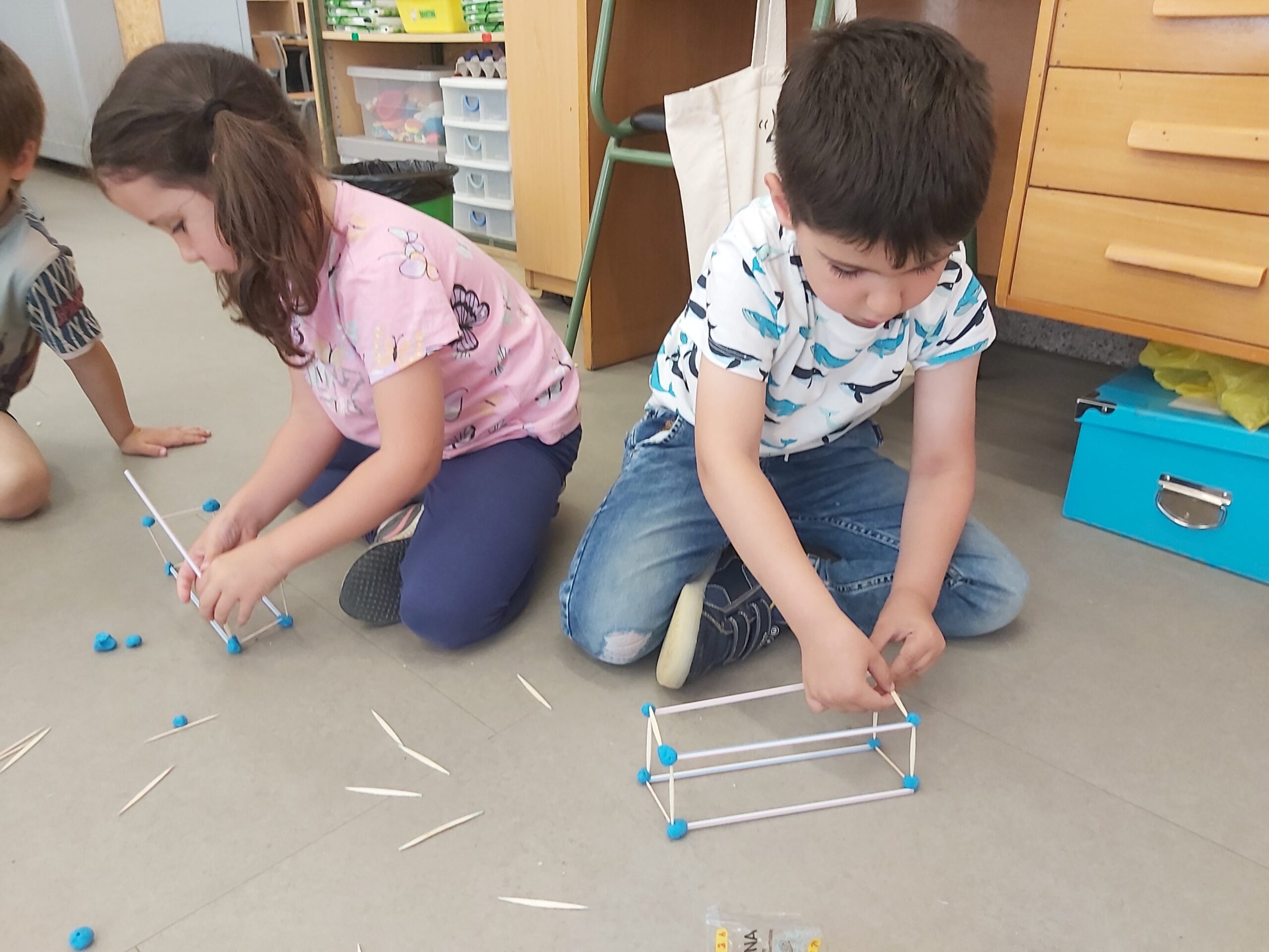 EN ACABAR EL MURAL, VAM CREAR DIFERENTS COSSOS GEOMÈTRICS AMB ESCURADENTS, CANYETES I PLASTILINA: