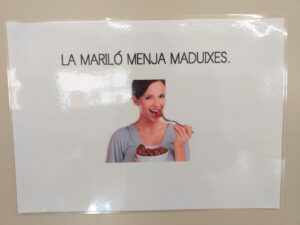 LA DE P5 A ÉS “LA MARILÓ MENJA MADUIXES” I LA DE P5 B “EL MONSTRE MENJA POMA”. AMB AQUESTES FRASES QUE ENS HEM INVENTAT TREBALLEM LA SEVA ESTRUCTURA, EL SIGNIFICAT DE CADA PARAULA, COM SONA CADA LLETRA… I AL FINAL DE TOT, FAREM UN DICTAT QUE ENS HAUREM DE PREPARAR A CASA DE DEURES.