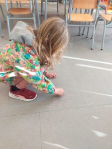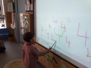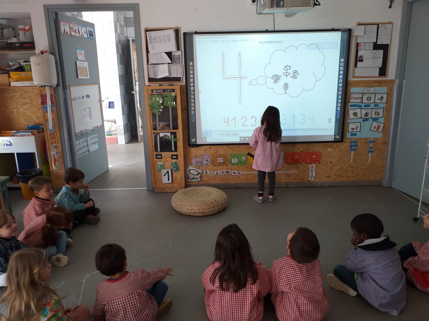 FA UNS DIES QUE HEM COMENÇAT A TREBALLLAR EL NÚMERO 4, TANT LA SEVA GRAFIA COM LA SEVA QUANTITAT.  AVUI HEM PRACTICAT FER LA GRAFIA AL TERRA AMB GUIXOS, DESPRÉS A LA PISSARRA DIGITAL I FINALMENT A LA NOSTRA FEINETA.  HO FEM MOLT BÉ!